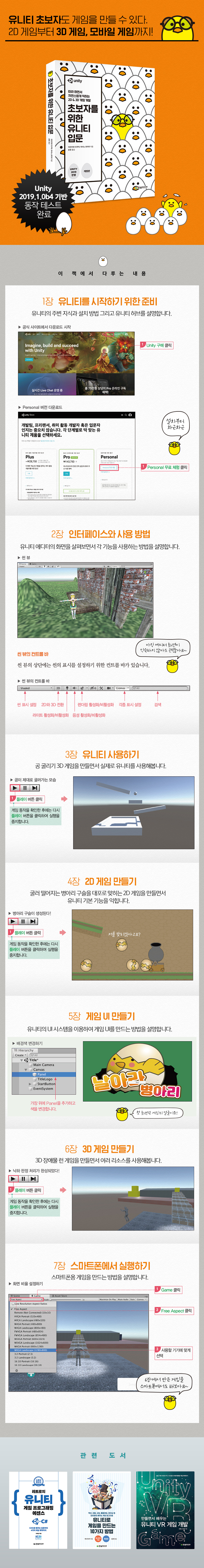 ÀÌ Ã¥Àº À¯´ÏƼ ¼³Ä¡ºÎÅÍ 2D, 3D °ÔÀÓ Á¦ÀÛ±îÁö ´Ù·é´Ù. Ãʺ¸ÀÚ°¡ °ÔÀÓ °³¹ß¿¡ ÇÊ¿äÇÑ »ç¿ë¹ýÀ» ½ÀµæÇÏ´Â µ¥ ÁýÁßÇÒ ¼ö ÀÖµµ·Ï ¼³Ä¡, ¼³Á¤, ¿¡µðÅÍ »ç¿ë¹ý, ÇÁ·ÎÁ§Æ®¿Í ¾À ±¸¼º, ¿ÀºêÁ§Æ® ¼³Á¤ µîÀ» ½±°Ô ¼³¸íÇÑ´Ù. À¯´ÏƼ ±âº»±â¸¦ ÀÍÇô 3D °ø ±¼¸®±â °ÔÀÓ°ú 2D ´ëÆ÷ °ÔÀÓÀ» ¸¸µé°í, À¯´ÏƼ UI ½Ã½ºÅÛÀ» ÀÌ¿ëÇØ °ÔÀÓ UIµµ Á¦ÀÛÇÑ´Ù. ¸¶Áö¸·À¸·Î 3D Àå¾Ö¹° ´Þ¸®±â °ÔÀÓÀ» ¸¸µé°í, ½º¸¶Æ®Æù¿ë °ÔÀÓÀ¸·Î ¼Õ½±°Ô º¯°æÇÏ´Â ¹æ¹ýµµ »ìÆìº»´Ù.