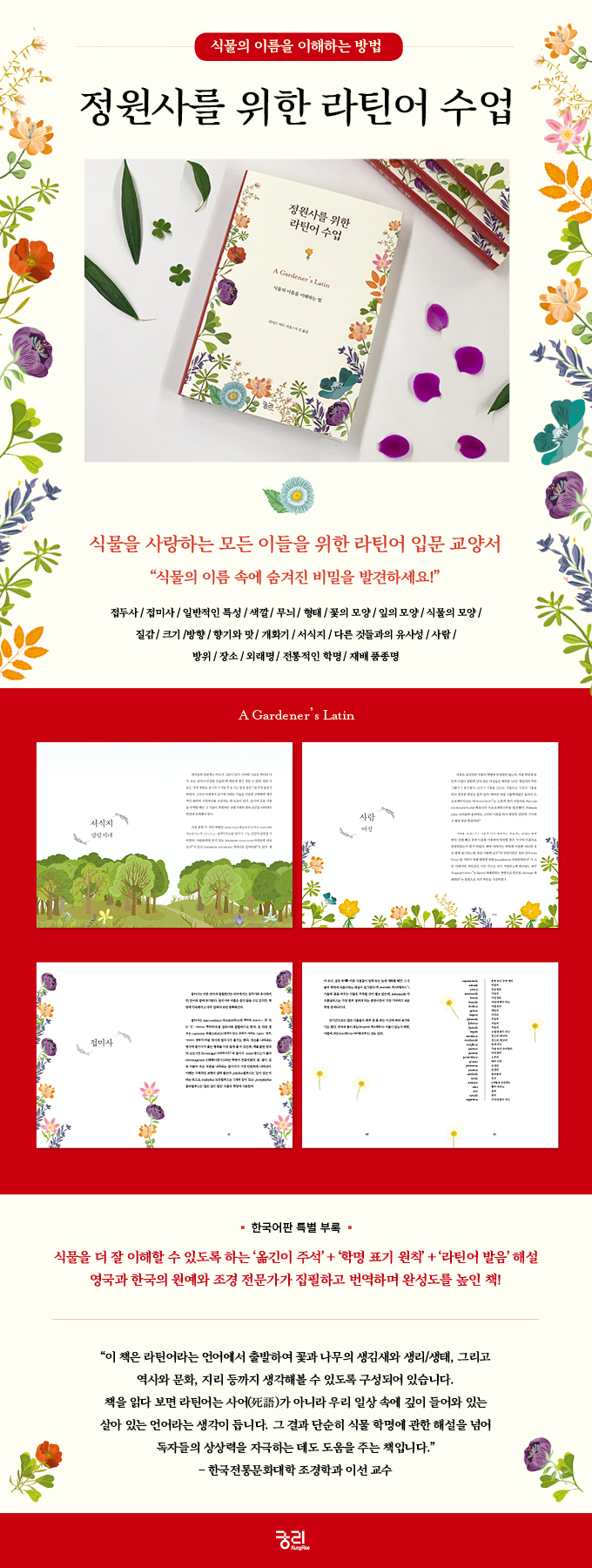 ¡°À̸§Àº ¼ÒÅëÀ» À§ÇÑ ¸íĪÀ¸·Î, »ç¹°¿¡ ´ëÇÑ Á¤º¸¸¦ Àü´ÞÇÒ ¼ö Àִ â±¸ ¿ªÇÒÀ» ÇÑ´Ù. ¶ÇÇÑ À̸§Àº ±× Á¸À縦 È®ÀνÃÄÑÁÖ´Â Áß¿äÇÑ ÁöÇ¥À̱⵵ ÇÏ´Ù. ¿ì¸®°¡ ¸ÅÀÏ ¸¶ÁÖÇÏ´Â ²É°ú ³ª¹«µµ Á¦°¢±â À̸§ Çϳª¾¿Àº °¡Áö°í ÀÖ´Ù. °°Àº ½Ä¹°ÀÌ¶óµµ ³ª¶ó¿Í Àå¼Ò¿¡ µû¶ó °¢±â ´Ù¸£°Ô ºÎ¸¥´Ù¸é È¥¶õ½º·¯¿ï °ÍÀÌ´Ù. À̸¦ ¹æÁöÇϱâ À§ÇØ ½Ä¹°º°·Î ´Ü ÇϳªÀÇ À̸§ÀÌ ÇÊ¿äÇѵ¥, ±×°ÍÀÌ ¹Ù·Î Çиí(ùÊÙ£, scientific name)ÀÌ´Ù. ÇиíÀº ¾ð¾î¿Í ±¹°æÀ» ³Ñ¾î ¼ÒÅëÇϱâ À§ÇÑ °øÅëºÐ¸ðÀÌÀÚ °íÀ¯ÇÑ À̸§À¸·Î, 18¼¼±â¿¡ ü°èÈµÇ¸é¼ ¼¼°è °øÅëÀÇ Ç¥Áؾ µÇ¾ú´Ù. ÀÌ Ã¥Àº Á¤¿ø»ç»Ó ¾Æ´Ï¶ó ½Ä¹°À» »ç¶ûÇÏ´Â ¸ðµç À̵éÀ» À§ÇÑ ±³¾ç¼¶ó°í ÇÒ ¼ö ÀÖ´Ù. ½Ä¹°¿¡ °üÇÑ ÇÑ ¼¼°è °øÅë¾îÀÎ ¶óƾ¾î¸¦ ÅëÇØ ½Ä¹°ÀÇ Æ¯¼º°ú À̸§ÀÇ À¯·¡¸¦ ¾Ë°Ô µÇ°í, ±×¿¡ ¾ôÈù ¿ª»ç¿Í ¹®È¿¡ ´«¶ß°Ô µÈ´Ù¸é ´õÇÒ ³ªÀ§ ¾ø°Ú´Ù.¡± - ¿Å±äÀÌÀÇ ±Û Áß¿¡¼
