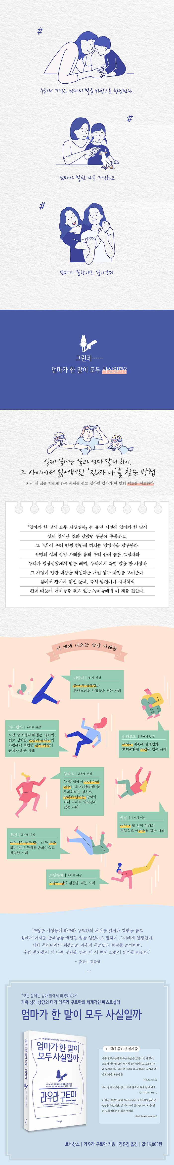 ¸ðµç »ç¶÷ÀÌ µéÀº ¸»°ú ½ÇÁ¦ °æÇè °£ÀÇ Â÷À̸¦ °æÇèÇßÀ»±î? ¾ÈŸ±õ°Ôµµ °æÇèÇÏÁö ¾ÊÀº »ç¶÷À» ã±â Èûµé Á¤µµÀÌ´Ù. µû¶ó¼ ´Ù¸¥ ¹®Á¦¿¡ Á¢±ÙÇϱâ Àü¿¡, ¿ì¼± ¹«½¼ ¾È°æÀ» ¾²°í ÀڽŰú ŸÀÎÀ» ¹Ù¶óº¸´ÂÁö Á¤È®È÷ ¾Ë¾Æ¾ß ÇÑ´Ù. ½Å³ä, »ý°¢, ÆÇ´Ü, ¼±È£, »îÀÇ ¹æ½ÄÀº Ãʱâ À¯³â ½ÃÀý¿¡ ´©±º°¡ÀÇ ¸»°ú ÃßÃøÀ¸·Î ¸¸µé¾îÁø´Ù. µû¶ó¼ »ì¸é¼ °è¼Ó ºÎ¸ðÀÇ ¸»°ú ¹Ý´ë ±æÀ» °£´Ù°Å³ª ±×ºÐµéÀÇ °üÁ¡À̳ª »îÀÌ ¿¾³¯ ¹æ½ÄÀ̶ó¼ ÀÚ½ÅÀÇ ¹æ½Ä°ú ÀüÇô ÀÏÄ¡ÇÏÁö ¾Ê´Â´Ù´Â ´À³¦À» ¹Þ¾Ò´Ù¸é, ±×·± ÀÌÀ¯ ¶§¹®ÀÌ´Ù. Áï, ´©±º°¡ÀÇ ¸»·Î ¸¸µé¾îÁ³±â ¶§¹®ÀÌ´Ù. ºÎ¸ð´Â ¾î¶² ¹æ¹ýÀ¸·Îµç ¿ì¸®ÀÇ ÀúÇ×°ú ¹ÝÇ×, ½Ç¼ö¸¦ ¾ð±ÞÇÑ´Ù. (pp.75~76)