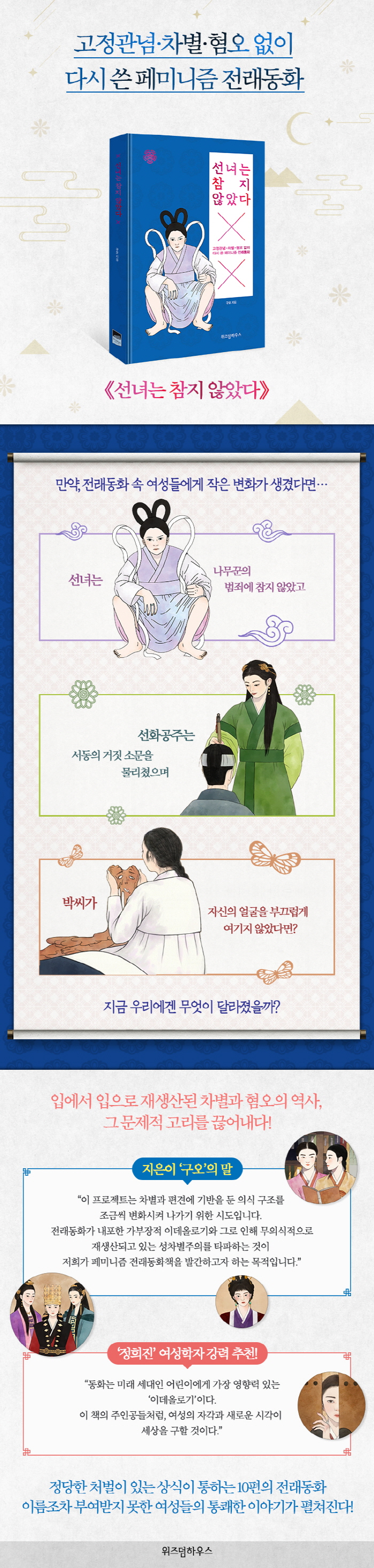 ¡¶¼±³à´Â ÂüÁö ¾Ê¾Ò´Ù¡·´Â Æä¹Ì´ÏÁò°ú »çȸÀ̽´¿¡ ´ëÇØ ±¸¿À°¡ ÀÐ°í °øºÎÇÑ °á½ÇÀÌ´Ù. ´ëÁߵ鿡°Ô Ä£¼÷Çϸ鼵µ ±âÁ¸ÀÇ ¼»ç¿¡¼ ¹®Á¦Àû ÁöÁ¡ÀÌ µå·¯³ª´Â Àü·¡µ¿È 10ÆíÀ» ¼±Á¤Çß°í, »ó»óÀÇ ³ª·¡¸¦ ÆîÃÄ ´Ù½Ã ½è´Ù. ´ëºÎºÐÀÇ Àü·¡µ¿È¿¡¼ ¿©¼ºÀº ³²¼ºÀ» µ½´Â ºÎ¼öÀû ¿ªÇҷθ¸ ±×·ÁÁö°Å³ª, ³²¼ºÀÇ ¿µ¿õÀû ¸é¸ð¸¦ º¸¿©ÁÖ±â À§ÇØ ¼Ò¸ðÀûÀ¸·Î »ç¿ëµÇ¾ú´Ù. ±¸¿À°¡ ´Ù½Ã ¾´ À̾߱⿡¼´Â ÁÖº¯ Àι°·Î¸¸ ¹¦»çµÇ´ø ¿©¼ºÀÇ ¸ñ¼Ò¸®¸¦ Àû±ØÀûÀ¸·Î ´ã¾Ò´Ù. ¸ðµç µîÀåÀι°µéÀÌ °íÁ¤µÈ ¼º¿ªÇÒ°ú Æí°ß¿¡¼ ¹þ¾î³ª ÀÖµµ·Ï ¿øÀüº¸´Ù ÈξÀ ´õ Àç¹ÌÀÖ°í ÀÔüÀûÀÎ À̾߱â·Î Ç®¾î³Â´Ù.