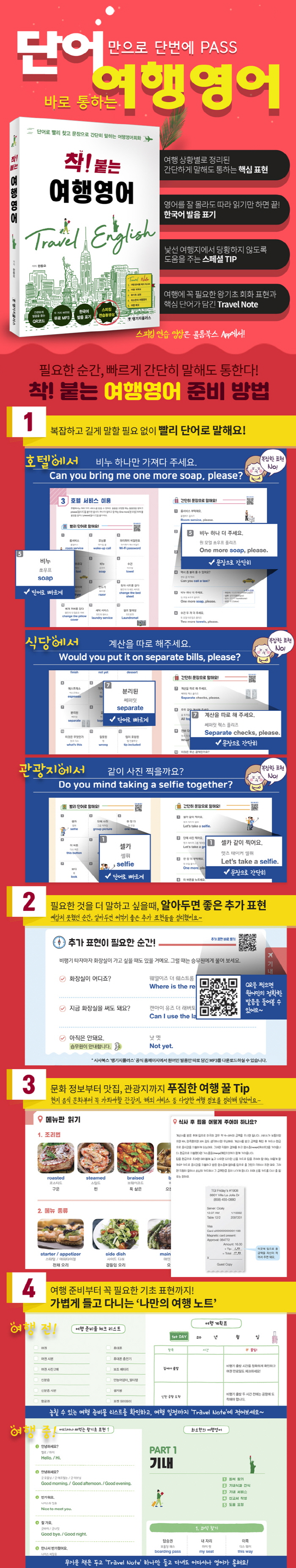¿µ¾î¸¦ ¸ô¶ó¼ ¿©ÇàÀ» ¸Á¼³Àδٸé, ³¸¼± ¿Ü±¹ ¹®È¿¡ µÎ·Á¿òÀÌ ÀÖ´Ù¸é, Âø! ºÙ´Â ¿©Ç࿵¾î ÇÑ ±Ç¸¸ µé°í °¡ º¸¼¼¿ä! ¿©ÇàÁö¿¡¼ ¸¸³¯ ¼ö ÀÖ´Â ±âº» »óȲ»Ó¸¸ ¾Æ´Ï¶ó ¿äÁò ¿©Çà Æ®·»µå¿¡ ¸Â´Â ´Ù¾çÇÑ Ç¥Çö°ú ¿©Çà Á¤º¸°¡ °¡µæ µé¾îÀÖ½À´Ï´Ù! * Ã¥¼ÓÃ¥ ºÎ·Ï : Travel Note (¿©Çà Áغñ¹° üũ ¸®½ºÆ®, ¿©Çà °èȹǥ, ¿Õ±âÃÊ Ç¥Çö, ÃÖ¼ÒÇÑÀÇ ¿©Ç࿵¾î, ¿©Çà¸Þ¸ð)