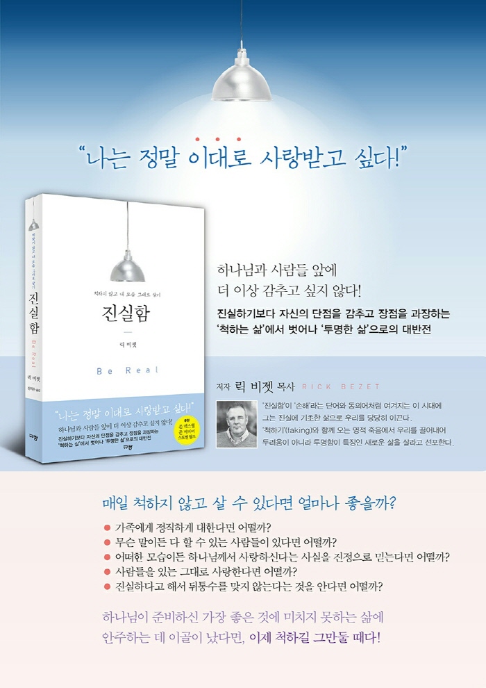 ÀúÀÚ ¸¯ ºñÁ¬ RICK BEZETÀº ¡®Áø½ÇÇÔ¡¯ÀÌ ¡®¼ÕÇØ¡¯¶ó´Â ´Ü¾î¿Í µ¿ÀǾîó·³ ¿©°ÜÁö´Â ÀÌ ½Ã´ë¿¡ ±×´Â Áø½Ç¿¡ ±âÃÊÇÑ »îÀ¸·Î ¿ì¸®¸¦ ´ç´çÈ÷ À̲ö´Ù. Çϳª´ÔÀÌ ¿¹¼ö ±×¸®½ºµµ¸¦ ÅëÇØ ¿ì¸®¸¦ À§ÇØ ÇàÇϽŠÀÏ¿¡ ºñÃß¾î ¿ì¸®ÀÇ ¸¶À½À» µÇã°í, ¿µÈ¥À» µÇ»ì¸®¸ç, »ý°¢À» »õ·Ó°Ô ÇÔÀ¸·Î½á ÁøÁ¤ÇÑ ÀÚÀ¯¿¡ À̸£´Â ±æÀ» º¸¿©ÁØ´Ù. ¶ÇÇÑ ¡®Ã´Çϱ⡯(faking)¿Í ÇÔ²² ¿À´Â ¿µÀû Á×À½¿¡¼ ¿ì¸®¸¦ ²ø¾î³»¾î µÎ·Á¿òÀÌ ¾Æ´Ï¶ó Åõ¸íÇÔÀÌ Æ¯Â¡ÀÎ »õ·Î¿î »îÀ¸·Î À̲ö´Ù.