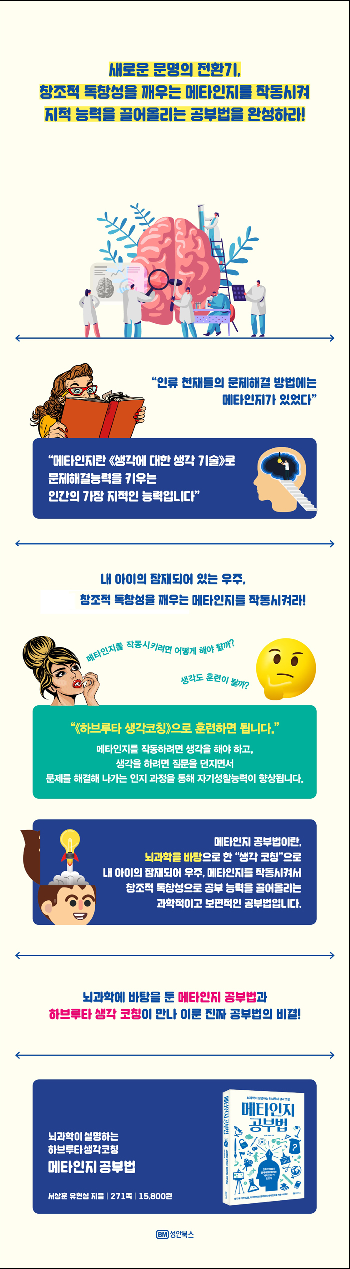 ÀÌ Ã¥ ¡¶¸ÞŸÀÎÁö °øºÎ¹ý¡·Àº ³» ¾ÆÀÌ¿¡°Ô ÀáÀçµÇ¾î ÀÖ´Â ¿ìÁÖ, ¸ÞŸÀÎÁö¸¦ ÀÛµ¿½ÃŰ´Â ¹æ¹ý°ú ±× µµ±¸Áß °¡Àå Áß¿äÇÑ ¡°ÇϺê·çŸ »ý°¢ ÄÚĪ¡±À» ÀÌ¿ëÇÏ¿© ³» ¾ÆÀ̸¸ÀÇ ÇнÀ ¹æ¹ýÀ» ã¾Æ³» ÁÁÀº ¼º°ø ½À°üÀ¸·Î À̾°¡´Â °úÇÐÀûÀÌ°í º¸ÆíÀûÀÎ °øºÎ¹ýÀÔ´Ï´Ù. ³» ¾ÆÀÌÀÇ °øºÎ¹ýÀÇ ¼ºÆÐ´Â ´Ù¸¥ ´©±¸ÀÇ °øºÎ¹ýÀÌ ¾Æ´Ñ, ³» ¾ÆÀ̸¸ÀÇ Ã¢Á¶Àû µ¶Ã¢·ÂÀÎ ¡°¸ÞŸÀÎÁö¡±¿¡ ÀÇÇØ °áÁ¤µÇ±â¿¡ ³ú°úÇÐÀ¸·Î ¼³¸íÇÏ´Â ¸ÞŸÀÎÁö °øºÎ¹ýÀÌ ´õ¿í °¡Ä¡°¡ ÀÖ´Â ÀÌÀ¯ÀÔ´Ï´Ù.