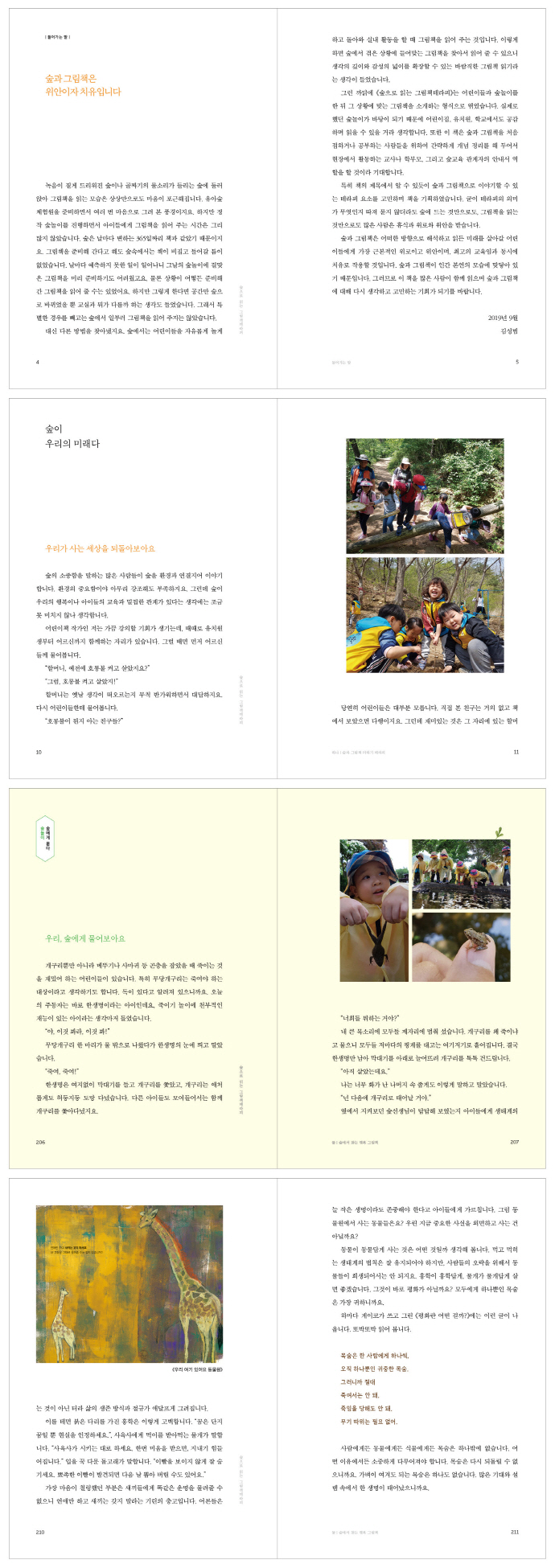 P. 46 ±×¸²Ã¥¿¡¼ ´À³¢´Â °Í°ú ¸¶Âù°¡Áö·Î ½£¿¡¼µµ ½Åºñ·Î¿î dz°æÀ» ¸¸³³´Ï´Ù. ¼Ò¸®¿Í Ã˰¨°ú ³¿»õ¿Í ¸ÀÀ» ¸¸³¯ ¼ö ÀÖ½À´Ï´Ù. ¿À°¨ÀÌ ±âÁö°³¸¦ ÄÕ´Ï´Ù. ¸¶¼ú ÁöÆÎÀ̰¡ ¿Â¸öÀ» °Çµå¸®µí Æò¼Ò¿¡´Â ¾²Áö ¾Ê´ø °¨°¢ÀÌ ÇϳªµÑ ¿¸®±â ½ÃÀÛÇÕ´Ï´Ù. Ưº°ÇÏ°í ³¸¼± ¼Ò¸®°¡ µé·Á¿À°í °®°¡Áö »ö±òµéÀÌ ´«¿¡ µé¾î¿É´Ï´Ù. ±×¸²Ã¥°ú ½£Àº ÀÌ·¸°Ô ž¸é¼ºÎÅÍ °¡Áö°í ÀÖ´ø º»¿¬ÀÇ ¿À°¨À» ¿¾î ÁÝ´Ï´Ù. ¿ÜºÎÀÇ ÀÚ±ØÀ» ¸ö°ú ¸¶À½À¸·Î ´À³¥ ¼ö ÀÖ´Â °Í, À̰ÍÀÌ Å×¶óÇÇÀÔ´Ï´Ù.
