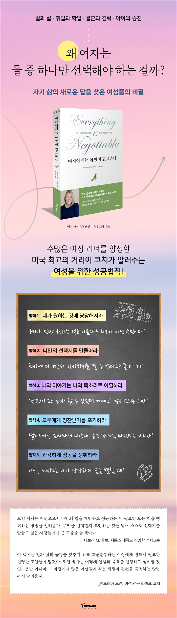 ¸ð°Ç ¹Ú»ç´Â ¿©¼ºÀÇ Àλý¿¡¼ ³¡¾øÀÌ À̾îÁö´Â °ÅÀý°ú ³°üÀ» ±Øº¹ÇÏ¸é¼ ¡®³»°¡ ¿øÇÏ´Â °Í¿¡ ´ç´çÇØÁö¸é ²ÞÀ» ÀÌ·ê ¼ö ÀÖ´Ù¡¯´Â »ç½ÇÀ» ¸ö¼Ò Å͵æÇß´Ù. ÀÌ·¯ÇÑ ±ú´ÞÀ½À» Åä´ë·Î Çо÷°ú »ý¾÷, Àϰú °áÈ¥, Àΰ£°ü°è »çÀÌ¿¡¼ ¾î·Á¿òÀ» °Þ´Â ¸¹Àº ¿©¼ºÈĹèµéÀÇ Ä¿¸®¾î¸¦ »ó´ãÇϰí ÀÖ´Ù. ¸ð°Ç ¹Ú»çÀÇ Áø½É ¾î¸° ÄÚĪÀº ÅõÀÚȸ»ç ´ëÇ¥ºÎÅÍ YWCA CEO±îÁö ´Ù¾çÇÑ ºÐ¾ßÀÇ ¿©¼º ¸®´õµéÀ» ¾ç¼ºÇß´Ù. ¡¶¿©ÀÚ¿¡°Ô´Â ¾ß¸ÁÀÌ ÇÊ¿äÇÏ´Ù¡·´Â ²ÞÀ» ÁÀ´Â Ä¿¸®¾î ¿ì¸ÕµéÀÇ ¸àÅäÀÎ ¸ð°Ç ¹Ú»çÀÇ Á¶¾ð°ú °Ý·Á¸¦ ¾Æ³¦¾øÀÌ ´ãÀº Ã¥À¸·Î, ¿©¼º±â¾÷ÀÎ ´ë»ó ¾ð·ÐÀÎ ¡´¸ð±âÁö ¿ì¸Õ ¸Å°ÅÁø¡µÀ» ºñ·Ô °¢Á¾ ¹Ìµð¾î¿¡¼ Çʵ¶µµ¼·Î ¼±Á¤µÇ¸ç ¸¹Àº Âù»ç¸¦ ¹Þ¾Ò´Ù.