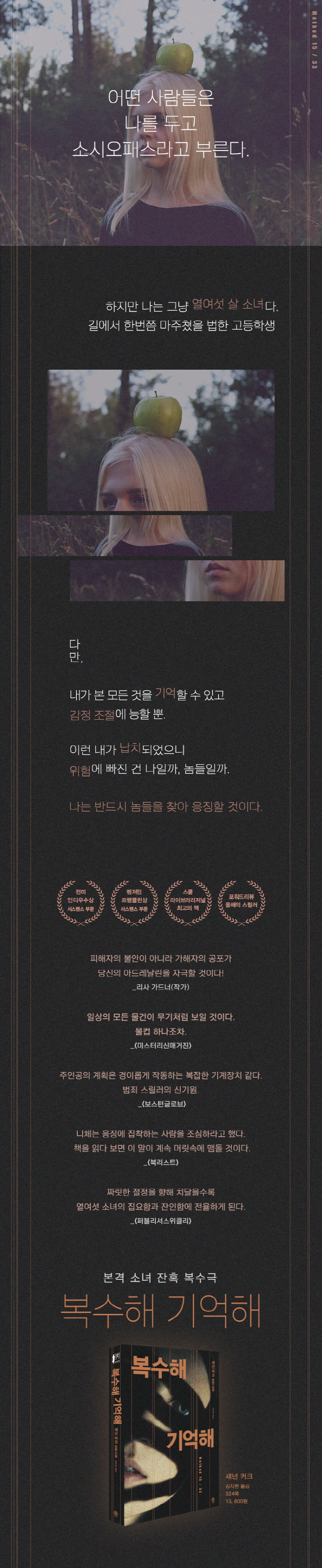 ¡¶º¹¼öÇØ ±â¾ïÇØ¡·´Â ¹üÁË ¼Ò¼³ÀÇ ½Å±â¿øÀ» ¸¶·ÃÇß´Ù´Â Æò´ÜÀÇ Âù»ç¿Í ÇÔ²² 2015³â Àü¹Ì Àεð¿ì¼ö»ó ¼½ºÆæ½º ºÎ¹®°ú º¥Àú¹Î ÇÁ·©Å¬¸°»ó ¼½ºÆæ½º ºÎ¹®À» ¼ö»óÇÏ´Â µî ¿ÏÀüÈ÷ »õ·Î¿î ½ºÅ¸ÀÏÀÇ ½É¸® ½º¸±·¯¸¦ ±â´Ù¸° µ¶ÀÚµéÀ» ¸Å·á½ÃÄ×´Ù. ÀÌÈÄ ¡¶ºñºñ¾ð ¸¶¼ÈÀÇ ´ë´ÜÇÑ ¿©ÇàThe Extraordinary Journey of Vivienne Marshall¡· ¡¶µ¢±¼ ¼Ó¿¡¼In the Vines¡· ¡¶±×·¹ÃµGretchen¡·À» ¿¬ÀÌ¾î ¹ßÇ¥ÇÏ¸ç º¯È£»ç ÀÏÀ» Çϸ鼵µ ³î¶ó¿ï ¸¸Å ¿Õ¼ºÇÑ ÀÛǰ Ȱµ¿À» À̾°í ÀÖ´Ù. ÇöÀç ¸Å»çÃß¼¼Ã÷¿¡¼ °¡Á·°ú ÇÔ²² »ì¸ç ´ÙÀ½ ÀÛǰÀ» ±¸»óÇϰí ÀÖ´Ù.