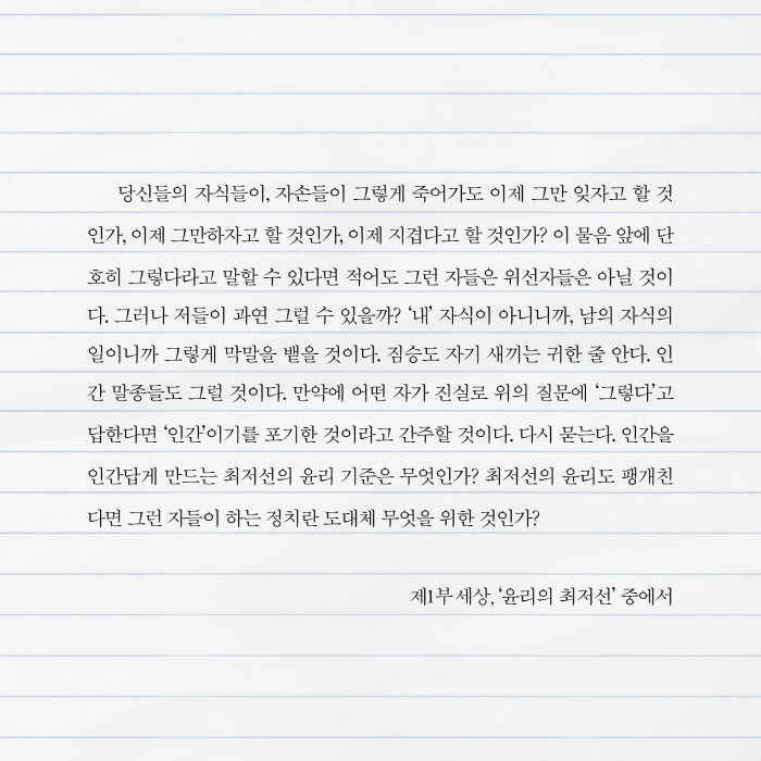 ´ç½ÅµéÀÇ ÀڽĵéÀÌ, ÀÚ¼ÕµéÀÌ ±×·¸°Ô Á׾µµ ÀÌÁ¦ ±×¸¸ ÀØÀÚ°í ÇÒ °ÍÀΰ¡, ÀÌÁ¦ ±×¸¸ÇÏÀÚ°í ÇÒ °ÍÀΰ¡, ÀÌÁ¦ Áö°ã´Ù°í ÇÒ °ÍÀΰ¡? ÀÌ ¹°À½ ¾Õ¿¡ ´ÜÈ£È÷ ±×·¸´Ù¶ó°í ¸»ÇÒ ¼ö ÀÖ´Ù¸é Àû¾îµµ ±×·± ÀÚµéÀº À§¼±ÀÚµéÀº ¾Æ´Ò °ÍÀÌ´Ù. ±×·¯³ª ÀúµéÀÌ °ú¿¬ ±×·² ¼ö ÀÖÀ»±î? ¡®³»¡¯ ÀÚ½ÄÀÌ ¾Æ´Ï´Ï±î, ³²ÀÇ ÀÚ½ÄÀÇ ÀÏÀÌ´Ï±î ±×·¸°Ô ¸·¸»À» ¹ñÀ» °ÍÀÌ´Ù. Áü½Âµµ Àڱ⠻õ³¢´Â ±ÍÇÑ ÁÙ ¾È´Ù. Àΰ£ ¸»Á¾µéµµ ±×·² °ÍÀÌ´Ù. ¸¸¾à¿¡ ¾î¶² ÀÚ°¡ Áø½Ç·Î À§ÀÇ Áú¹®¿¡ ¡®±×·¸´Ù¡¯°í ´äÇÑ´Ù¸é ¡®Àΰ£¡¯À̱⸦ Æ÷±âÇÑ °ÍÀ̶ó°í °£ÁÖÇÒ °ÍÀÌ´Ù. ´Ù½Ã ¹¯´Â´Ù. Àΰ£À» Àΰ£´ä°Ô ¸¸µå´Â ÃÖÀú¼±ÀÇ À±¸® ±âÁØÀº ¹«¾ùÀΰ¡? ÃÖÀú¼±ÀÇ À±¸®µµ ÆØ°³Ä£´Ù¸é ±×·± ÀÚµéÀÌ ÇÏ´Â Á¤Ä¡¶õ µµ´ëü ¹«¾ùÀ» À§ÇÑ °ÍÀΰ¡?