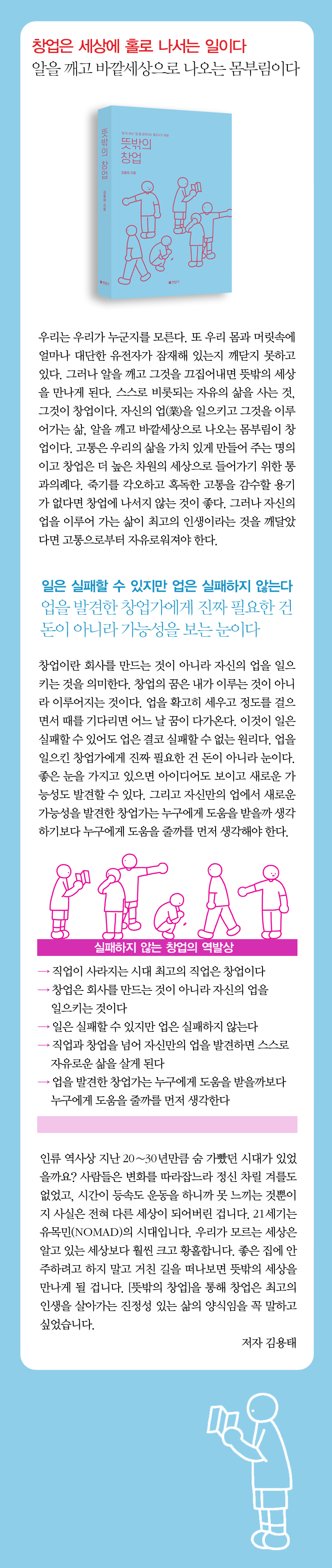 ±è ¼ÒÀåÀº ÇöÀç ¿ì¸®»çȸ°¡ ¾È°í ÀÖ´Â ¹®Á¦Á¡À» ÇØ°áÇÒ ¼ö ÀÖ´Â ÃÖ°íÀÇ ¼Ö·ç¼ÇÀº â¾÷À̶ó°í Áø´ÜÇÑ´Ù. À̰ÍÀÌ À̹ø Ã¥À» ÃâÆÇÇÏ°Ô µÈ ÀÌÀ¯´Ù. ±×ÀÇ ¸Þ½ÃÁö¿¡´Â ¹Ì·¡¸¦ ¿¹ÃøÇÏ´Â ±â¸·Èù ÅëÂû·ÂÀÌ ´ã°Ü ÀÖ´Ù. ¶Ç Àç¹ÌÀÖÀ¸¸é¼µµ ¹¬Á÷ÇÏ°Ô ¿ï¸°´Ù. ±×°ÍÀº ¼¿ï´ë¿¡¼ Àι®Çаú °æ¿µÇÐ(°æ¿µÇÐ ¼®»ç)À» °øºÎÇÏ°í »ç¾÷ ÇöÀå¿¡¼ üÇèÇÑ ¾ß»ý¼ºÀÌ À¶ÇյǾî Àֱ⠶§¹®ÀÏ °ÍÀÌ´Ù.