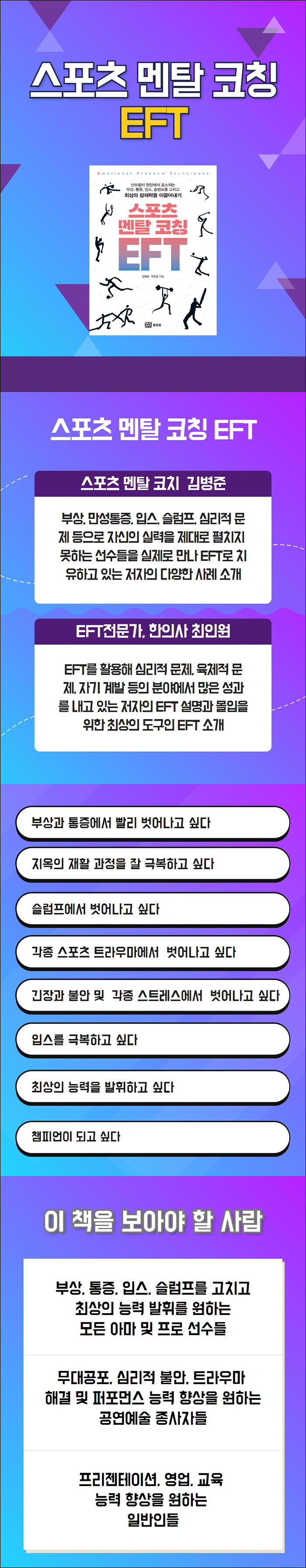 P. 155 ¿©±â¼ ´Ù½Ã ¿Ö EFT°¡ ÇǷΠȸº¹°ú ½ºÆ®·¹Äª¿¡ ÃÖÀûÀÇ µµ±¸ÀÎÁö ±× ÀÌÀ¯¸¦ °£´ÜÈ÷ Á¤¸®Çغ¸ÀÚ. ù°, EFT¸¦ ²ÙÁØÈ÷ ÇÏ¸é ¿îµ¿À¸·Î ÇÇ·ÎÇØÁø ±ÙÀ°°ú Á¶Á÷ÀÌ ºü¸£°Ô ȸº¹µÇ¾î¼ ÅëÁõ°ú °¡µ¿ ¹üÀ§¿Í À¯¿¬¼ºÀÌ ´«¿¡ ¶ç°Ô ÁÁ¾ÆÁø´Ù. µÑ°, EFT´Â ¸¶»çÁö ¹ÞÀ» ¶§ ´À³¢´Â ±×·± ÅëÁõÀÌ ¾ø¾î¼ ¾ÆÁÖ Æí¾ÈÇÏ´Ù. ¼Â°, EFT´Â Àå¿ä±Ùó·³ ÃËÁöÇϱâ Èûµç ½ÉºÎ ±ÙÀ°±îÁö ÀÚ¿¬½º·´°Ô Ç®¾îÁØ´Ù. ³Ý°. ¹°¸®ÀûÀÎ µµ±¸¿Í °ø°£°ú »ç¶÷ÀÌ ÇÊ¿äÇÑ ±âÁ¸ÀÇ ¹æ¹ýº¸´Ù ÈξÀ °£ÆíÇÏ°í °æÁ¦ÀûÀÌ´Ù.