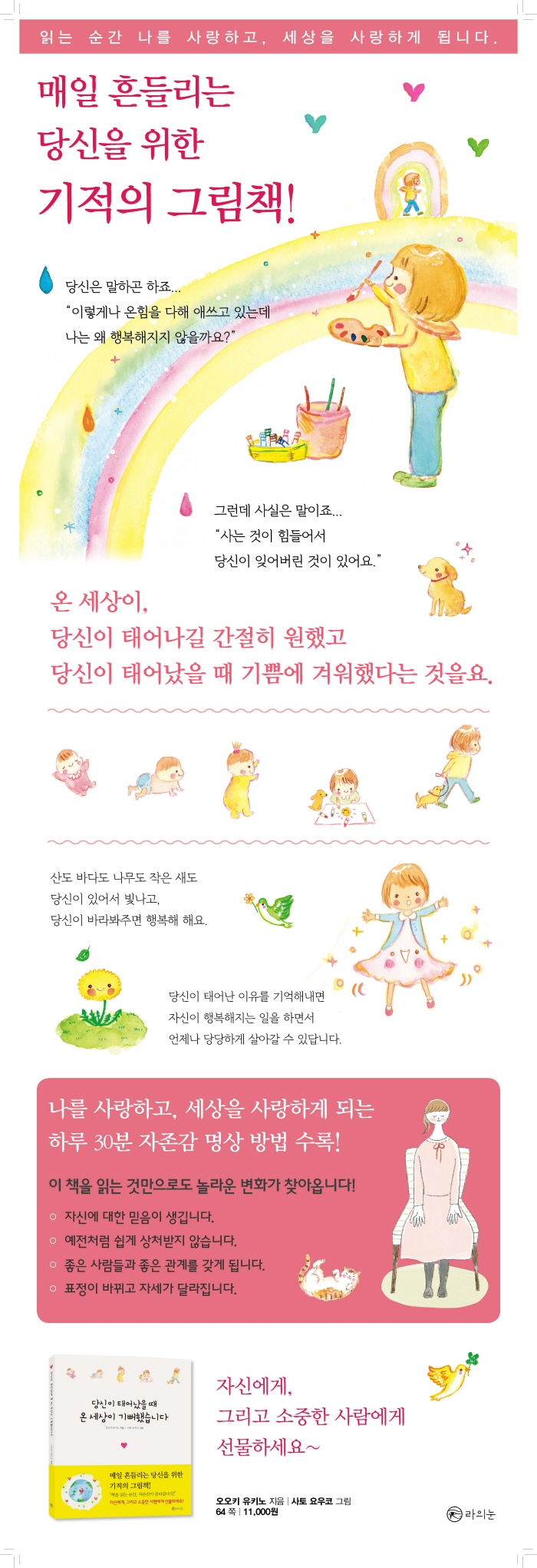 ÀÚ½ÅÀ» »ç¶ûÇÏÁö ¸øÇÏ´Â »ç¶÷µéÀÌ ÀÚÁ¸°¨À» ȸº¹ÇÏ°í ´Ù¸¥ »ç¶÷µé°úÀÇ °ü°è¸¦ ±àÁ¤ÀûÀ¸·Î ¸®¼ÂÇϵµ·Ï µµ¿ÍÁִ åÀÌ´Ù. ÀÌ Ã¥Àº Çü½ÄºÎÅÍ µ¶Æ¯ÇÏ´Ù. ¾Æµ¿¿ë ±×¸²Ã¥À̶ó´Â ÇüŸ¦ ¶ì°í ÀÖ´Â °ÍÀÌ´Ù. Ã¥ÀÇ Á¦¸ñ ±×´ë·Î ÀÚ½ÅÀÌ Å¾À» ¶§ ¾î¶² ÀÏÀÌ ÀϾ°í, ±×°ÍÀÌ ¾î¶² Àǹ̸¦ °®´ÂÁö ±â¾ïÇØ³»´Â °ÍÀÌ¾ß ¸»·Î ÀÚÁ¸°¨ ȸº¹ÀÇ Ã¹ °ÉÀ½ÀÓÀ» ½Ã»çÇÏ´Â ¹Ù°¡ Å©´Ù. ±×¸²Ã¥À» Àдø ½ÃÀý, ¾Æ¹«·± Æí°ß°ú ºÎÁ¤Àû °¨Á¤ÀÇ °³ÀÔÀÌ ¾øÀÌ ¼¼»óÀ» ÀÖ´Â ±×´ë·Î ¹Þ¾Æµé¿´´ø °Íó·³ ÀÌ Ã¥À» ¶È°°ÀÌ Àо°¡¸é µÈ´Ù´Â ÇÔÀǰ¡ ÀÖ´Ù. Áï, ÀÚÁ¸°¨Àº ȸº¹ÇÏ´Â °ÍÀÌ ¾Æ´Ï¶ó Áø½ÇÀ» ±â¾ïÇØ³»´Â °ÍÀÌ´Ù. ÀÌ Ã¥Àº ÀÚ½ÅÀ» »ç¶ûÇÒ ¼ö ¾ø±â¿¡ ´Ù¸¥ »ç¶÷°ú ¼¼»ó ¿ª½Ã »ç¶ûÇÒ ¼ö ¾ø´Â »ç¶÷µéÀ» À§ÇÑ µû¶æÇÑ Ã³¹æÀüÀÌÀÚ »îÀÇ Áø½Ç¿¡ Á¢±ÙÇÏ´Â »ýȰ ¼ÓÀÇ ¸í»óÄ¡À¯¹ýÀÌ´Ù.