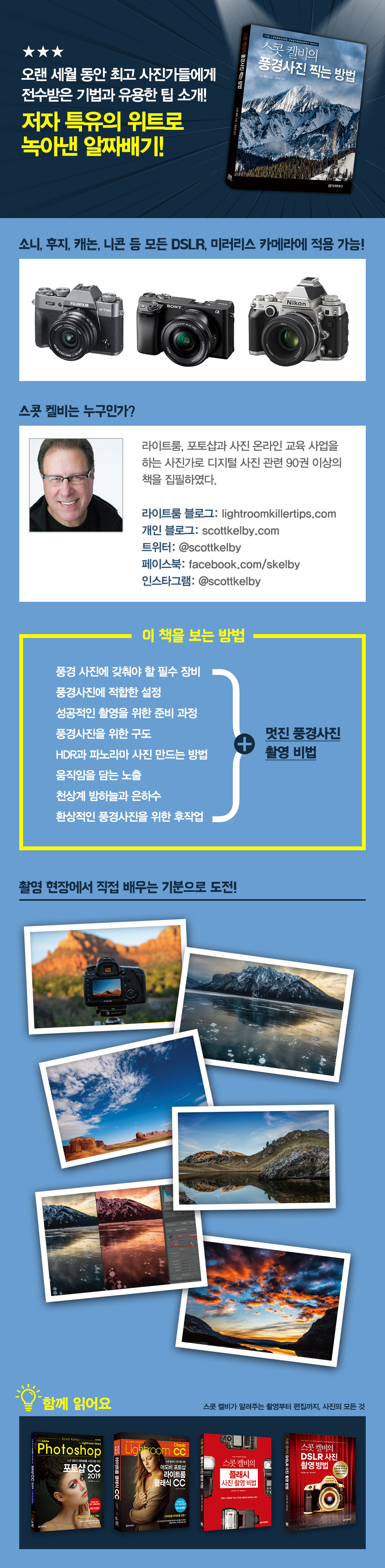 ¶óÀÌÆ®·ë, Æ÷Åä¼¥°ú »çÁø ¿Â¶óÀÎ ±³À° »ç¾÷À» Àü¹®À¸·Î ÇÏ´Â KelbyOneÀÇ ´ëÇ¥ ÀÌ»çÀÌ´Ù. ±×´Â ÀâÁö >Photoshop User>ÀÇ ÆíÁýÀåÀÌÀÚ ¹ßÇàÀÎÀ̰í >Lightroom Magazine>ÀÇ ÆíÁýÀåÀ̸ç, »çÁø°¡¸¦ À§ÇÑ ÁÖ°£ ÀÎÅͳݹæ¼Û >The Grid>ÀÇ ÁøÇàÀÚÀÌ´Ù. ¶ÇÇÑ ¸Å³â ¿¸®´Â Çà»ç Scott Kelby¡¯s Worldwide Photo WalkÀÇ ¼³¸³ÀÚÀÌ´Ù.