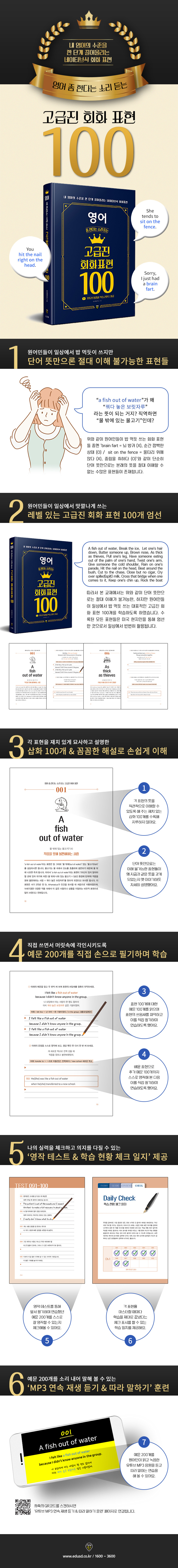 ¿©·¯ºÐ, ÀÌÁ¦ ¡®How are you? / I¡¯m fine.¡¯ ¼öÁØÀ» ¹þ¾î³ Á» ´õ ·¹º§ ÀÖ´Â ¿µ¾î¸¦ ¹è¿ì°í ½ÍÁø ¾ÊÀ¸½Å°¡¿ä? Çѱ¹¾î·Îµµ ¡®¼Õ¹ßÀÌ Ã´Ã´ ¸Â´Ù, ¾î±ú Æì°í ´Ù´Ï´Ù, ½Ã°£À» Àâ¾Æ¸Ô´Ù¡¯¿Í °°Àº Ç¥ÇöÀ» ¾²µí, ¿ø¾î¹Îµéµµ ÀÌ·¯ÇÑ ¼öÁØ ÀÖ´Â ¸À±ò³ Ç¥ÇöµéÀ» ¹ä ¸Ôµí ¾²¸ç ¼ÒÅëÇÕ´Ï´Ù. µû¶ó¼ º» ±³Àç¿¡¼´Â ÀÌó·³ ¿ø¾î¹ÎµéÀÌ Àϻ󿡼 °¡Àå ¸¹ÀÌ ¾²´Â °í±ÞÁø ¿µ¾î È¸È Ç¥Çö 100°³¸¦ ¹è¿ì°íÀÚ ÇÕ´Ï´Ù.