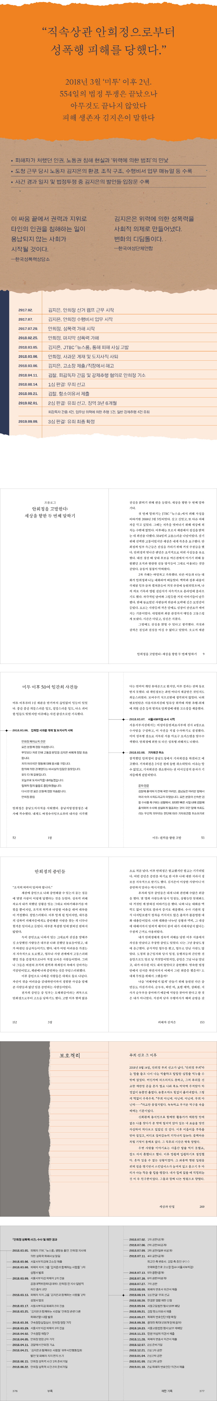 ´ëÇÐ Á¹¾÷ ÈÄ º¸ÅëÀÇ ¿©¼º ³ëµ¿Àڷμ ¼º½ÇÇÏ°Ô »ì¾Æ¿Ô´Ù. ¾î·Á¼´Â ¼Á¡À» ¿î¿µÇÏ´Â °ÍÀÌ ²ÞÀ̾ú°í ´ëÇп¡¼ ¹®ÇÐÀ» °øºÎÇßÀ¸¸ç Á¤ºÎ ºÎó¿¡¼ È«º¸ ºÐ¾ß ¾÷¹«¸¦ Çß´Ù. 10¿© ³â°£ ºñÁ¤±ÔÁ÷ ³ëµ¿ÀÚ·Î ÀÏÇϸç Á¤±Û °°Àº °è¾àÁ÷ »ýȰÀ» °æÇèÇß°í, ÀÌÈÄ ¶æÀÖ´Â ÀÏ¿¡ º¸ÅÆÀÌ µÇ°Ú´Ù´Â ¹Ù¶÷À» ¾È°í Á¤Ä¡ÀÎ ¾ÈÈñÁ¤ÀÇ ¼±°Å Ä·ÇÁ¿¡ µé¾î°¬´Ù. 2017³â 7¿ù ¾ÈÈñÁ¤ Ãæ³²µµÁö»çÀÇ ¼öÇàºñ¼·Î ¹ß·É¹Þ¾Æ ¿©¼ºÀ¸·Î´Â óÀ½À¸·Î µµÁö»ç ¼öÇàºñ¼°¡ µÇ¾ú´Ù. 2018³â »ó»ç ¾ÈÈñÁ¤ÀÇ ¼ºÆø·Â ¹üÁ˸¦ ¼¼»ó¿¡ ¾Ë¸° ÈÄ Á÷ÀåÀ» ÀÒ¾ú°í °í¹ß 554ÀÏ ¸¸¿¡ ´ë¹ý¿ø À¯ÁË ÃÖÁ¾ ÆÇ°áÀ» ¹Þ¾Æ³Â´Ù. ÇÇÇØ »ýÁ¸Àڷμ ÅõÀïÇØ¿Â Áö³³¯À» µó°í ´Ù½Ã ÀÏ»óÀ¸·Î µ¹¾Æ°¥ ¼ö Àֱ⸦ ¼Ò¸ÁÇÑ´Ù.