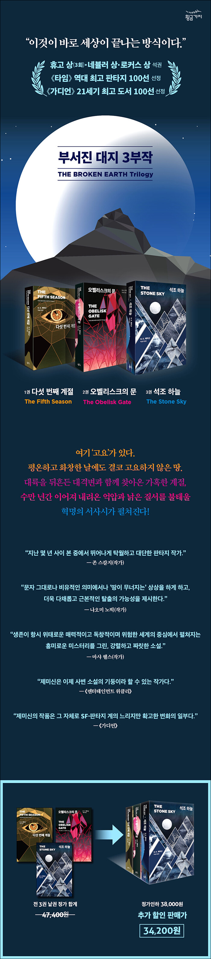 ±ÇÀ§ÀÇ À帣¹®ÇлóÀÎ ÈÞ°í »ó, ³×ºæ·¯ »ó, ·ÎÄ¿½º »óÀ» ¼®±ÇÇÏ°í ¡¶Å¸ÀÓ¡·ÀÌ ¼±Á¤ÇÑ ¿ª´ë ÃÖ°íÀÇ ÆÇŸÁö 100¼±¿¡ ¿À¸£¸ç 21¼¼±â¸¦ ´ëÇ¥ÇÏ´Â °ÉÀÛÀ¸·Î ¼Õ²ÅÈ÷°í ÀÖ´Â 3ºÎÀÛ. ÁöÁúÇÐÀû °³³ä¿¡ ±â¹ÝÇÏ¿© Á¤±³ÇÏ°Ô Â¥¿©Áø µ¶Ã¢Àû ¼¼°è°ü ¼Ó¿¡¼ Á¾¸»°ú Çõ¸íÀ̶õ Å׸¶¸¦ ³ì¿©³½ ÀÌ 3ºÎÀÛÀº ¿À·§µ¿¾È ¹éÀÎ ³²¼ºÀÌ ÁÖ·ù¿´´ø À帣¿¡ Áö°¢ º¯µ¿À» ÀÏÀ¸Å² ±â³äºñÀûÀÎ ½Ã¸®Áî·Î, Àü ¼¼°è 20¿© °³±¹¿¡ Ãâ°£µÇ¾úÀ¸¸ç ÀúÀÚ N. K. Á¦¹Ì½ÅÀ» ÀÏ¾à ¹Ð¸®¾ð¼¿·¯ ÀÛ°¡ÀÇ ¹Ý¿¿¡ µî±Ø½ÃÄ×´Ù.