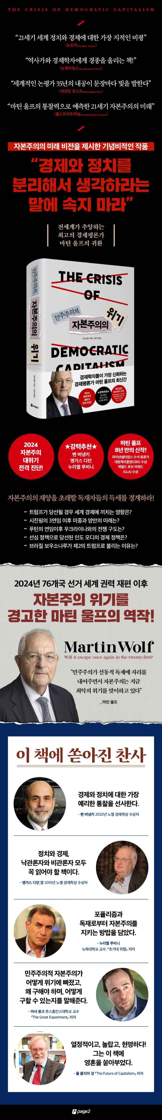 ¼¼°èÀûÀÎ °æÁ¦Æò·Ð°¡ÀÎ ¸¶Æ¾ ¿ïÇÁ´Â 2016³â Æ®·³ÇÁ ´ëÅë·ÉÀÇ Åº»ýÀ» ÁöÄѺ¸¸ç ¡º¹ÎÁÖÁÖÀÇÀû ÀÚº»ÁÖÀÇÀÇ À§±â¡»ÀÇ ÁýÇÊÀ» °á½ÉÇß´Ù°í ¹àÈù ¹Ù ÀÖÀ¸¸ç, Æ®·³ÇÁÀÇ ´ë¼± Èĺ¸ º¹±Í°¡ Á¡ÃÄÁö±â ½ÃÀÛÇß´ø 2023³â 3¿ù¿¡ ÀÌ Ã¥ÀÇ ¿ø¼(¡ºTHE CRISIS OF DEMOCRATIC CAPITALISM¡»)¸¦ Ãâ°£Çß´Ù. ±×´Â ÀÚº»ÁÖÀÇ Ã¼Á¦´Â ¹ÎÁÖÁÖÀÇ¿ÍÀÇ ¾ÈÁ¤ÀûÀÎ °áÈ¥ »ýȰÀ» ÅëÇØ¼¸¸ ¹ø¿µÀ» ±¸°¡ÇÒ ¼ö ÀÖ´Ù°í ¸»Çϸç À̸¦ À§ÇØ Æ÷ǽ¸®Áò¿¡ ÀÇÇØ ¹ÎÁÖÁÖÀǰ¡ ÈѼյǴ °ÍÀ» °æ°èÇÏ°í »õ·Î¿î ÇüÅÂÀÇ ¡®´ºµô¡¯ÀÌ ÇÊ¿äÇÏ´Ù°í ÁöÀûÇÑ´Ù. ÀÌ Ã¥À» ÅëÇØ ÀÚº»ÁÖÀÇÀÇ Áö¼ÓÀ» À§ÇÑ ¹ÎÁÖÁÖÀÇÀÇ ¿ªÇÒÀ» È®ÀÎÇϰí Áö±Ý ¿ì¸®°¡ ÁغñÇØ¾ß ÇÒ °ÍµéÀ» È®ÀÎÇÏ±æ ¹Ù¶õ´Ù.