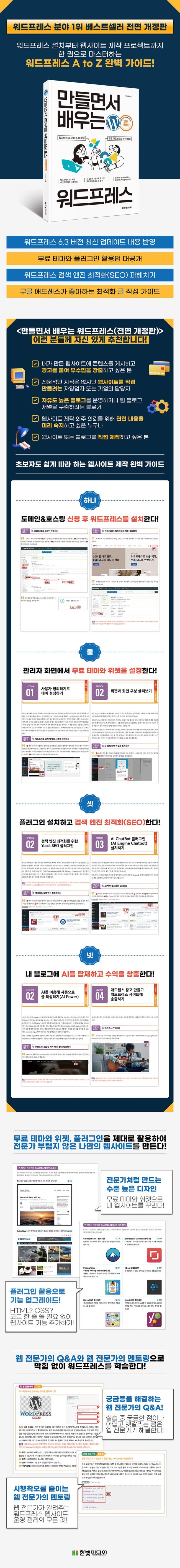 ¿öµåÇÁ·¹½º ºÐ¾ß º£½ºÆ®¼¿·¯ÀÎ ¡¶¸¸µé¸é¼ ¹è¿ì´Â ¿öµåÇÁ·¹½º¡·ÀÇ Àü¸é °³Á¤ÆÇÀ¸·Î 2024³â Ãֽо÷µ¥ÀÌÆ®µÈ ¿öµåÇÁ·¹½º 6.3 ¹öÀü ³»¿ëÀ» ¹Ý¿µÇÏ¿´´Ù. ÀÌ Ã¥ ÇÑ ±ÇÀ¸·Î ÃֽйöÀü(6.3 ¹öÀü)ÀÇ ¿öµåÇÁ·¹½º ¼³Ä¡ºÎÅÍ ¸®¾ó À¥»çÀÌÆ® Á¦ÀÛ, ¼öÀÍ Ã¢Ãâ±îÁö ¿öµåÇÁ·¹½º¸¦ ¿Ïº®ÇÏ°Ô Á¤º¹ÇÒ ¼ö ÀÖ´Ù. ¶ÇÇÑ ÀÌ Ã¥Àº À¥¼ºñ½º¿¡ ´ëÇÑ ±âÃÊ Áö½ÄºÎÅÍ ¿öµåÇÁ·¹½º ¼³Ä¡, °ü¸®ÀÚ ¼³Á¤, ¹«·á Å׸¶¿Í Ç÷¯±×ÀΠȰ¿ë±îÁö ¿öµåÇÁ·¹½º¸¦ ¹è¿ì´Â Àüü °úÁ¤À» °í½º¶õÈ÷ ´ã¾Æ ÀÔ¹®ÀÚµµ ½±°Ô ÇнÀÇÒ ¼ö ÀÖµµ·Ï ±¸¼ºµÇ¾ú´Ù.
