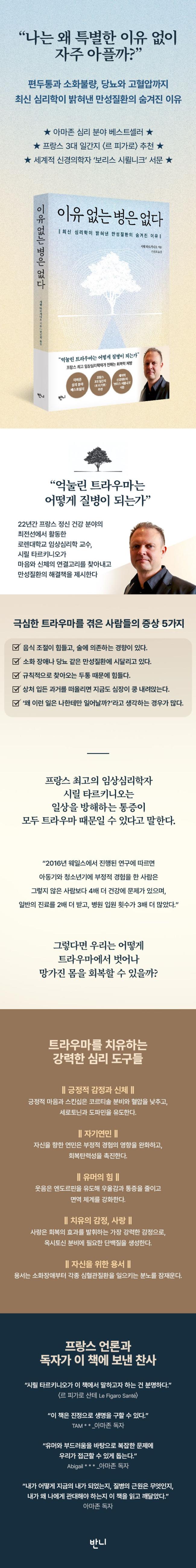 ÇÁ¶û½º ÀÓ»ó½É¸®ÇÐÀÚ ½Ã¸± Ÿ¸£Å°´Ï¿À´Â ¸»ÇÑ´Ù. ¾î¼¸é ¿ì¸® ¸öÀÌ ²÷ÀÓ¾øÀÌ ¾ÆÇ ÀÌÀ¯°¡ Æ®¶ó¿ì¸¶ ¶§¹®ÀÏ ¼öµµ ÀÖ´Ù°í ¸»ÀÌ´Ù. Æ®¶ó¿ì¸¶°¡ PTSD³ª ¿ì¿ïÁõ °°Àº ¸¶À½ÀÇ º´À» ÀÏÀ¸Å²´Ù´Â À̾߱â´Â µé¾îºÃÀ» ¹ý ÇÏÁö¸¸, Æ®¶ó¿ì¸¶°¡ ¿ì¸® ¸ö±îÁö ¸Á°¡¶ß¸± ¼ö ÀÖ´Ù´Â ÁÖÀåÀº Á¶±Ý ³¸¼³´Ù. ±×·±µ¥ ¿Ö ÇÁ¶û½ºÀÇ ½É¸®ÇÐÀÚ´Â ¿ì¸® °Ç° ¹®Á¦ÀÇ ÁÖ¹üÀ¸·Î Æ®¶ó¿ì¸¶¸¦ Áö¸ñÇßÀ»±î? ±×´Â ÀÌ Ã¥ ¡ºÀÌÀ¯ ¾ø´Â º´Àº ¾ø´Ù¡»¿¡¼ ¿ì¸®°¡ ¹Ìó ¶°¿Ã¸®Áö ¸øÇß´ø Æ®¶ó¿ì¸¶ÀÇ ¿µÇâÀ» ³¹³¹ÀÌ µå·¯³½´Ù. ÁÖ·Î À¯¾Æ±âºÎÅÍ Ã»¼Ò³â±â »çÀÌ¿¡ °ÞÀº ºÎÁ¤Àû »ç°ÇÀÌ, ¼ºÀÎÀÌ µÈ ¿ì¸®ÀÇ ½Åü¿Í Á¤½Å °Ç°¿¡ ¾î¶² ¿µÇâÀ» ¹ÌÄ¡´ÂÁö ÂùÂùÈ÷ »ìÇÇ¸é¼ Æ®¶ó¿ì¸¶¿Í ¿ì¸® ¸öÀÇ °ü°è¸¦ ±Ô¸íÇϰí ÀÖ´Ù.