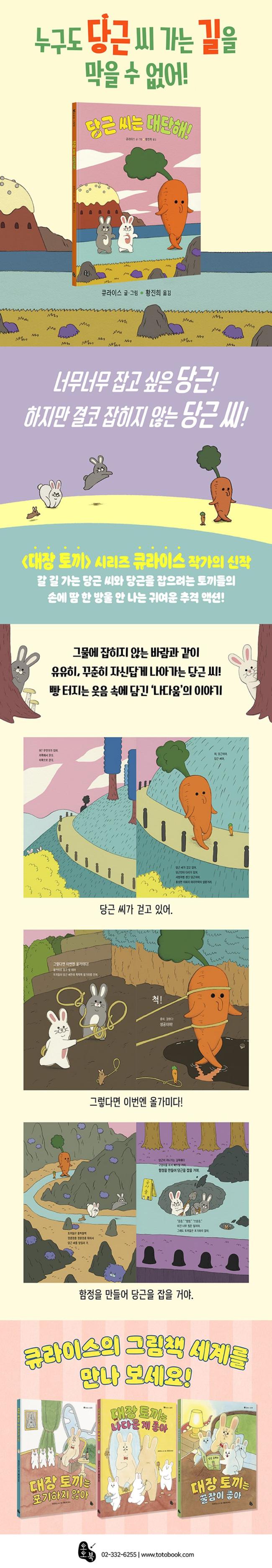 ¡º´ç±Ù ¾¾´Â ´ë´ÜÇØ!¡»´Â ¡´´ëÀå Åä³¢¡µ ½Ã¸®Áî ±×¸²Ã¥À» ¸¸µç Å¥¶óÀ̽º ÀÛ°¡ÀÇ ½ÅÀÛÀÔ´Ï´Ù. Æ÷±â¸¦ ¸ð¸£´Â Åä³¢µéÀÌ ´ç±ÙÀ» ÂѽÀ´Ï´Ù. ´ç±ÙÀº º¸±â¸¸ ÇØµµ ħÀÌ ²Ã±ï ³Ñ¾î°¡°Ô ¸ÀÀÖÀ¸´Ï±î¿ä. ÇÏÁö¸¸ ¿ì¸®ÀÇ ÁÖÀΰø ´ç±ÙÀº º¸Åë ´ç±ÙÀÌ ¾Æ´Õ´Ï´Ù. dz¼ºÇÑ ÀÌÆÄ¸® ¸Ó¸®Ä«¶ôÀ» ÈÖ³¯¸®¸é¼ Àڱ⸸ÀÇ ´ç±Ù °ÉÀ½À¸·Î °È´Â ´ç±Ù ¾¾, ±× ´©±¸µµ ¸·À» ¼ö ¾ø´Â ´ç±Ù ¾¾Áö¿ä. Åä³¢µéÀº ´ç±ÙÀ» µû¶ó°¡¸ç °®Àº ¹æ¹ýÀ¸·Î ÀâÀ¸·Á ÇÏÁö¸¸, ´ç±Ù ¾¾´Â °áÄÚ ÀâÈ÷Áö ¾Ê¾Æ¿ä. ±×·¸´Ù°í ¸Â¼ ½Î¿ì´Â °Íµµ ¾Æ´Õ´Ï´Ù. ±×¾ß¸»·Î ±×¹°¿¡ ÀâÈ÷Áö ¾Ê´Â ¹Ù¶÷°ú °°ÀÌ ³ª¾Æ°¥ »ÓÀÔ´Ï´Ù. Åä³¢¿Í ´ç±Ù ¾¾ÀÇ ÂÑÁö¸¸ ÂѱâÁö ¾Ê´Â ¿ôÀ½ ÅÍÁö´Â Ãß°Ý ¾×¼Ç À̾߱⠼ӿ¡¼ ³ª´Ù¿òÀ̶õ ¹«¾ùÀΰ¡ Áú¹®À» ³²±â´Â °¨µ¿À» ¸¸³ª º¸¼¼¿ä!