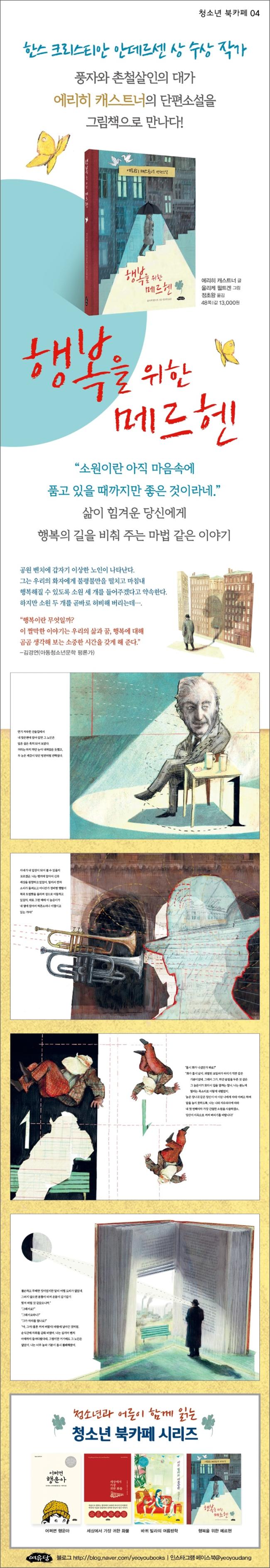 ¡ºÇູÀ» À§ÇÑ ¸Þ¸£Çî¡»Àº ¼Ò¼³ ¡ºÆÄºñ¾È¡», ½ÃÁý ¡º¸¶ÁÖº¸±â¡», µ¿È ¡ºÇÏ´ÃÀ» ³ª´Â ±³½Ç¡» µîÀ¸·Î ¼¼°èÀû ¸í¼ºÀ» ¾òÀº µ¶ÀÏÀÇ ´ëÇ¥ ¼Ò¼³°¡ÀÌÀÚ ½ÃÀÎÀÌ¸ç ¾î¸°ÀÌÃ¥ ÀÛ°¡ÀÎ ¿¡¸®È÷ ij½ºÆ®³Ê°¡ 1947³â¿¡ ¾´ ´ÜÆí¼Ò¼³À» ±×¸²Ã¥À¸·Î ź»ý½ÃŲ ÀÛǰÀÌ´Ù. ¡°µ¿½Ã´ë¸¦ À̾߱âÇÏÁö¸¸ ¾î´À ½Ã´ë¿¡³ª ÅëÇÏ´Â ÀÛ°¡¡±¶ó°í ÇÑ Ç츣¸¸ Çì¼¼ÀÇ Æòó·³, ÀÌ ÀÛǰ ¿ª½Ã ÀηùÀÇ ¿µ¿øÇÑ ÁÖÁ¦ÀÌÀÚ ¼Ò¸ÁÀÎ ¡®Çູ¡¯¿¡ °üÇÑ µ¶Æ¯ÇÑ ÅëÂûÀ» ´ã°í ÀÖ¾î ¿¡¸®È÷ ij½ºÆ®³Ê ÇÏ¸é ¶°¿À¸£´Â ÇØÇаú dzÀÚ, ÃÌö»ìÀÎÀÇ ¸é¸ð¸¦ ¿©½ÇÈ÷ È®ÀÎÇÒ ¼ö ÀÖ´Ù. ¶ÇÇÑ ¿ï¸®ÄÉ ¹¢Æ®°ÕÀÇ ½É¿ÀÇÑ ±×¸²ÀÌ »ó»ó°ú ÇØ¼®ÀÇ ¿©Áö¸¦ dzºÎÇÏ°Ô ¿¾î ÁÖ¾î µ¶ÀÚµéÀ» Áñ°Ì°Ô ÇÑ´Ù.