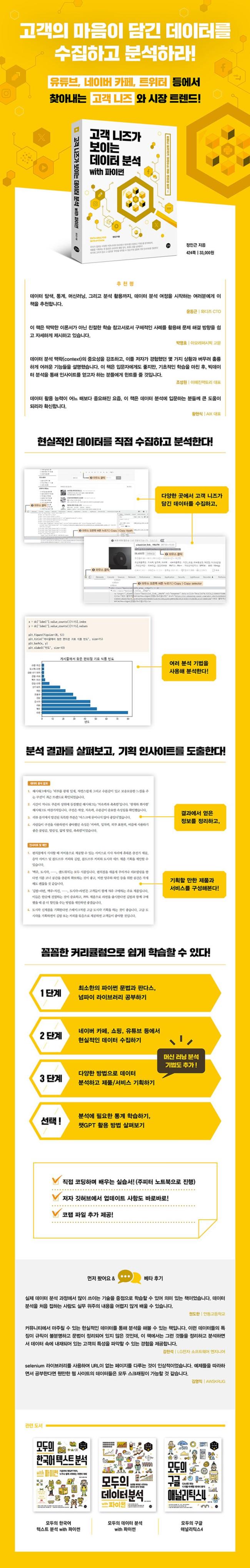 µ¥ÀÌÅÍ ½Ã´ë¿¡¼ »ì¾Æ°¡°í ÀÖ´Â ¸¸Å, µ¥ÀÌÅ͸¦ ºÐ¼®ÇØ ÀÇ»ç °áÁ¤À» ³»¸®´Â ÀÏÀÌ ³Ê¹«µµ ´ç¿¬ÇØÁ³´Ù. ÇÏÁö¸¸ Âû³ªÀÇ ¼ø°£¿¡µµ µ¥ÀÌÅͰ¡ ¹«¼öÈ÷ ½×ÀÌ´Â Å¿¿¡ Á¤ÀÛ Áß¿äÇÑ Á¤º¸¸¦ Á¦´ë·Î ÆÄ¾ÇÇϱⰡ Èûµé´Ù. ÀÌ·± µ¥ÀÌÅÍ È«¼ö ¼Ó¿¡¼ ¿ì¸®´Â ¾î¶»°Ô °¡Ä¡ ÀÖ´Â µ¥ÀÌÅ͸¦ °¡·Á³»°í À̸¦ ºñÁî´Ï½º¿¡ Ȱ¿ëÇÒ ¼ö ÀÖÀ»±î? ÀÌ Ã¥Àº ¿ì¸®°¡ ÀÚÁÖ »ç¿ëÇÏ´Â Ä¿¹Â´ÏƼ³ª ³×À̹ö Ä«Æä, À¯Æ©ºê, Æ®À§ÅÍ µî¿¡¼ µ¥ÀÌÅ͸¦ ¼öÁýÇØ ´Ù¾çÇÑ ±â¹ýÀ¸·Î ºÐ¼®ÇÑ´Ù. ÁÖÁ¦¸¶´Ù ºÐ¼®ÀÌ ¸ðµÎ ³¡³ª¸é, ¿©±â¼ ¾î¶² Á¤º¸¸¦ ¾òÀ» ¼ö ÀÖ´ÂÁö, ºñÁî´Ï½º¿¡ ¾î¶»°Ô Ȱ¿ëÇÒ ¼ö ÀÖ´ÂÁö¸¦ »ý°¢Çغ»´Ù. ÆÄÀ̽㠹®¹ýºÎÅÍ ³ÑÆÄÀÌ, ÆÇ´Ù½º µî µ¥ÀÌÅÍ ºÐ¼®¿¡ ÇÊ¿äÇÑ °³³äµµ ¼³¸íÇϹǷΠÇÁ·Î±×·¡¹Ö Áö½ÄÀÌ ºÎÁ·Çصµ °ÆÁ¤ ¾øÀÌ º¼ ¼ö ÀÖ´Ù. ±âÃÊ Åë°èµµ ¸¶Áö¸· Àå¿¡ µû·Î ¼ö·ÏµÇ¾î ÀÖ¾î ¸ð¸£´Â °³³ä¸¸ ¼±ÅÃÀûÀ¸·Î ÀÐÀ» ¼ö ÀÖ´Ù. ÀÇ¹Ì ÀÖ´Â µ¥ÀÌÅÍ·Î ¼ÒºñÀÚÀÇ ´ÏÁ Æ®·»µå¸¦ ¾Ë°í ½Í°Å³ª Èï¹Ì·Î¿î ¿¹Á¦·Î µ¥ÀÌÅÍ ºÐ¼®¿¡ ÀÔ¹®ÇÏ°í ½Í´Ù¸é ÀÌ Ã¥À» °·ÂÇÏ°Ô ÃßõÇÑ´Ù.