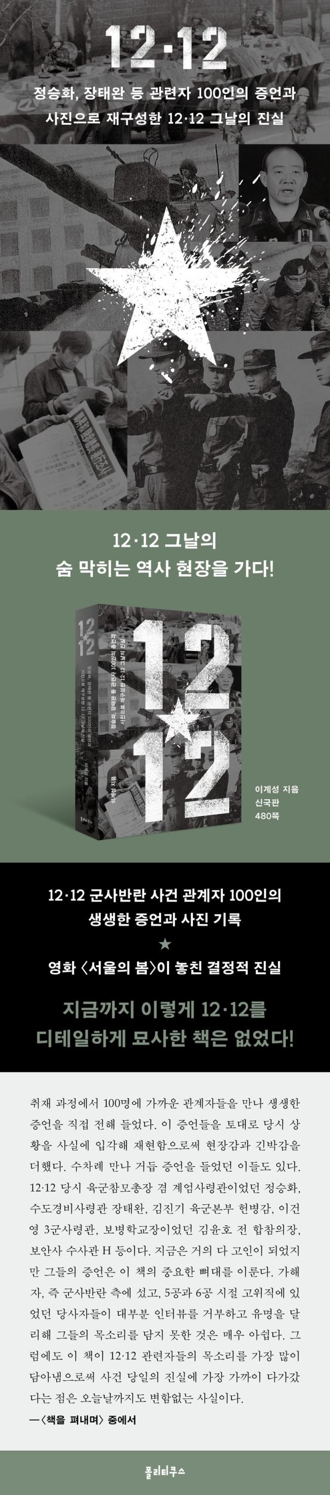 ±âÀÚ Æ¯À¯ÀÇ ÃëÀç·Â°ú ¹®Àå·ÂÀ¸·Î 1979³â 12¿ù 12ÀÏÀÇ ±ä¹ÚÇÑ »óȲÀ» »ýµ¿°¨ ÀÖ°Ô ¹¦»çÇÑ ÀÌ Ã¥Àº ´ç½ÃÀÇ ¿ª»ç ÇöÀåÀ» ÀÔüÀûÀ¸·Î À籸¼ºÇßÀ» »Ó ¾Æ´Ï¶ó, °¡Àå ¸¹Àº °ü·ÃÀÚµéÀÇ »ý»ýÇÑ ¸ñ¼Ò¸®¸¦ ´ã¾Æ³¿À¸·Î½á ±×³¯ÀÇ Áø½ÇÀ» ÀÖ´Â ±×´ë·Î µé·ÁÁØ´Ù. MZ¼¼´ë µ¶ÀÚµéÀÇ ÀÌÇØ¸¦ µ½±â À§ÇØ ÇÁ·Ñ·Î±×¿Í ¿¡Çʷα׸¦ ÅëÇØ 12¡¤12 ±º»ç¹Ý¶õÀÌ ÀϾ°Ô µÈ ÀüÈÄ ¸Æ¶ôÀ» »ìÇÊ ¼ö ÀÖ°Ô ÇßÀ¸¸ç, Àι°¿¡ ´ëÇÑ »ó¼¼ÇÑ ÁÖ¿Í °ü·Ã »çÁøÀ» dzºÎÇÏ°Ô ½Ç¾ú´Ù.
