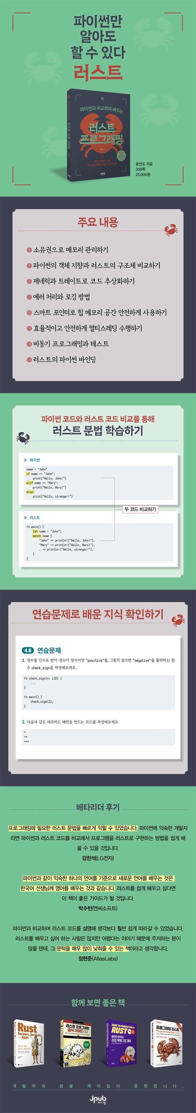 ÆÄÀ̽㠰³¹ßÀÚ¸¦ À§ÇÑ À¯ÀϹ«ÀÌÇÑ ·¯½ºÆ® ÀÔ¹®¼. ÀÌ Ã¥Àº ÆÄÀ̽ã ÄÚµå¿Í ·¯½ºÆ® Äڵ带 ºñ±³ÇÏ¸é¼ Â÷ÀÌÁ¡°ú À¯»çÁ¡À» ¹ß°ßÇϰí, ·¯½ºÆ®¸¦ ½±°Ô ÀÌÇØÇϵµ·Ï µµ¿ÍÁØ´Ù. ÆÄÀ̽ãÀ» ¸ð¸£´õ¶óµµ Ä£ÀýÇÑ ¼³¸íÀ¸·Î ·¯½ºÆ®ÀÇ Å¸ÀÔ ½Ã½ºÅÛ, ÇÔ¼ö, Ŭ·ÎÀú, ¸ÅÅ©·Î µî ±âº» °³³äÀ» ºü¸£°Ô ÀÍÈú ¼ö ÀÖÀ¸¸ç, ÆÄÀ̽㿡 Àͼ÷ÇÏ´Ù¸é ·¯½ºÆ®ÀÇ ¼ÒÀ¯±Ç°ú Á¦³×¸¯, Æ®·¹ÀÌÆ®, ¸ÖƼ½º·¹µù, Å×½ºÆ® µî °í±Þ °³³äÀ» È®½ÇÈ÷ ÀÌÇØÇÏ´Â µ¥ µµ¿òÀÌ µÉ °ÍÀÌ´Ù. ·¯½ºÆ®¸¦ »ç¿ëÇØº» °³¹ßÀÚ¶ó¸é ´Ù¸¥ ¾ð¾î¿ÍÀÇ ºñ±³¸¦ ÅëÇØ ·¯½ºÆ®¿¡ ´ëÇØ ¹Ìó ¸ô¶ú´ø ºÎºÐÀ» ¹ß°ßÇÒ ¼ö ÀÖ´Ù.