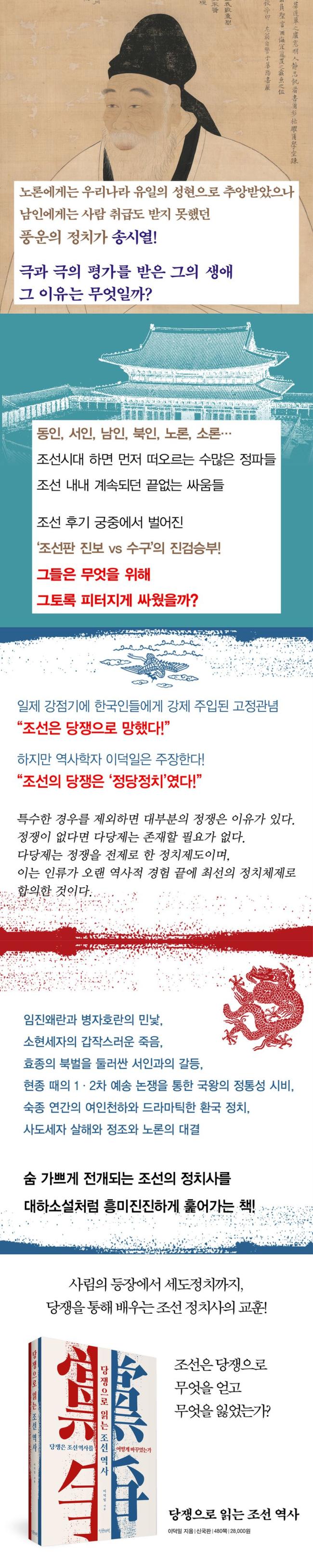 ¡º´çÀïÀ¸·Î Àд Á¶¼± ¿ª»ç¡»´Â ¡®»ç¸²ÀÇ µîÀå¿¡¼ ¼¼µµÁ¤Ä¡±îÁö¡¯ Á¶¼±ÀÇ ¼±ºñµéÀÌ Á¤Ä¡±Ç·ÂÀ» µÎ°í ¾î¶»°Ô ½Î¿ü´Â°¡, ±× °úÁ¤¿¡¼ Á¶¼±ÀÇ ¿ª»ç°¡ ¾î¶»°Ô Èê·¯°¬´Â°¡¸¦ ¸íÄèÇÏ°Ô Á¤¸®Çϰí ÇØ¼®ÇÑ´Ù. ´çÀïÀÇ ½ÃÀÛ, ÀÓÁø¿Ö¶õ°ú º´ÀÚÈ£¶õÀÇ ¹Î³¸, ¼ÒÇö¼¼ÀÚÀÇ °©ÀÛ½º·¯¿î Á×À½, È¿Á¾ÀÇ ºÏ¹úÀ» µÑ·¯½Ñ ¼ÀΰúÀÇ °¥µî, ÇöÁ¾ ¶§ÀÇ 1¡¤2Â÷ ¿¹¼Û ³íÀïÀ» ÅëÇÑ ±¹¿ÕÀÇ Á¤Å뼺 ½Ãºñ, ¼÷Á¾ ¿¬°£ÀÇ ¿©ÀÎõÇÏ¿Í µå¶ó¸¶Æ½ÇÑ È¯±¹ Á¤Ä¡, »çµµ¼¼ÀÚ »ìÇØ¿Í Á¤Á¶¿Í ³ë·ÐÀÇ ´ë°á µî ¼û °¡»Ú°Ô Àü°³µÇ´Â Á¶¼±ÀÇ Á¤Ä¡»ç¸¦ ¸¶Ä¡ ´ëÇϼҼ³Ã³·³ Èï¹ÌÁøÁøÇÏ°Ô ÈȾ´Ù.