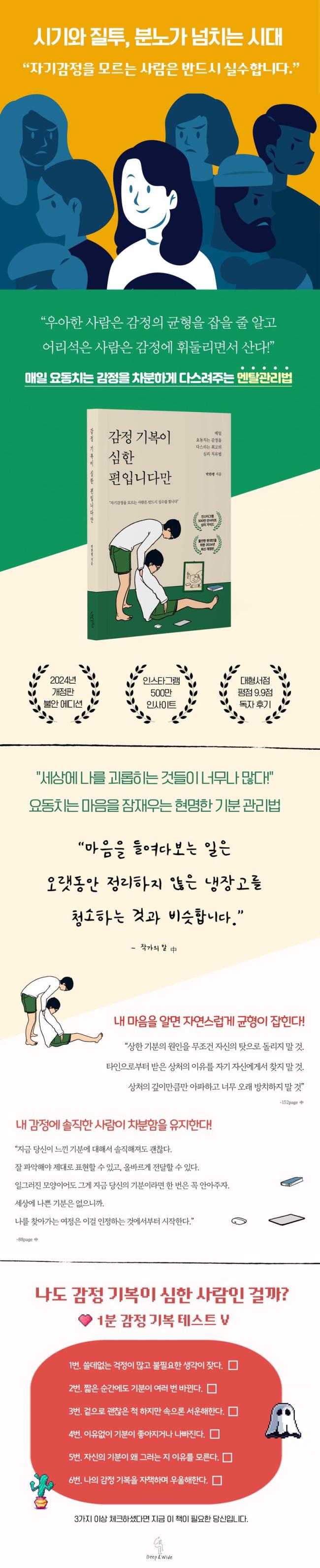 2024³â ÃÖ¼± °³Á¤ÆÇÀ¸·Î Ãâ°£µÈ ¡º°¨Á¤ ±âº¹ÀÌ ½ÉÇÑ ÆíÀÔ´Ï´Ù¸¸¡»¿¡´Â ·Ñ·¯ÄÚ½ºÅÍ °°Àº °¨Á¤À» Â÷ºÐÈ÷ ¸¸µé¾îÁÖ´Â ½¬¿î ±âºÐ °ü¸®¹ý°ú ³» »îÀ» µ¹¾Æº¼ ¼ö ÀÖ´Â Áú¹®µéÀÌ ´ã°ÜÀÖ´Ù. ¿ì¸®°¡ ¿Ö ³ªÀÇ °¨Á¤À» ¾Ë¾Æ¾ß Çϰí, ¾î¶»°Ô ÇÏ¸é ºÒ¾È°ú ¿ì¿ï°¨À» ¹þ¾î³¯ ¼ö ÀÖ´ÂÁö¿¡ ´ëÇÑ ¸íÈ®ÇÑ ÇØ´äÀº °¨Á¤ ±âº¹ÀÌ ½ÉÇÑ ´ç½Å¿¡°Ô ¾ÆÁÖ ½Ã¿øÇÑ ÅëÄèÇÔ°ú ±³ÈÆÀ» ¼±»çÇØÁÙ °ÍÀÌ´Ù.