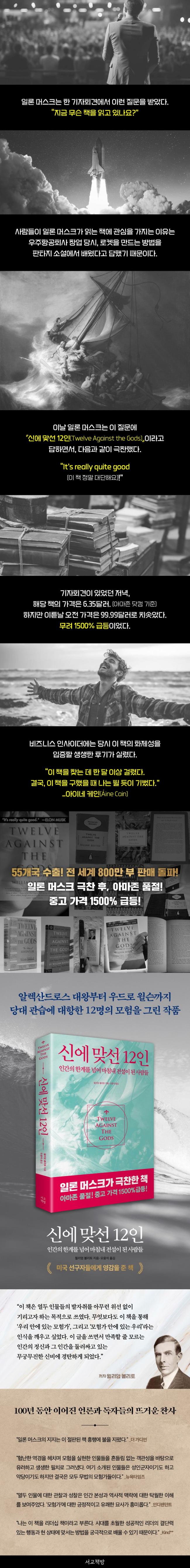 55°³±¹ ¼öÃâ, Àü¼¼°è 800¸¸ ºÎ ÆÇ¸Å¶ó´Â ÀÌ ³î¶ó¿î Ã¥Àº ÀÏ·Ð ¸Ó½ºÅ©ÀÇ ÇѸ¶µð¿¡ Áß°íÃ¥ °¡°ÝÀÌ 1500% ±ÞµîÇϰí, Ãâ°£µÈ Áö 100³âÀÌ µÈ Áö±Ý±îÁöµµ ²ÙÁØÈ÷ ÆÇ¸ÅµÇ´Â º£½ºÆ®¼¿·¯´Ù. ¿ì¸®´Â Àΰ£ÀÇ ÇѰ踦 ³Ñ¾î ³î¶ó¿î Çຸ¸¦ º¸ÀÌ´Â Àι°µéÀÇ ºñ¹ÐÀ» ¾Ë°í ½Í¾îÇÑ´Ù. ÀÏ·Ð ¸Ó½ºÅ©´Â ±×·± Àι° Áß ´ëÇ¥°ÝÀÎ Àι°ÀÌ´Ù. ±×·± ±×°¡ Èï¹Ì·Ó°Ô Àаí ÀÖ´Ù°í ¼Ò°³ÇÑ ÀÌ Ã¥¿¡¼ ¿ì¸®´Â ¹«¾ùÀ» ãÀ» ¼ö ÀÖÀ»±î? ÀÌ Ã¥¿¡¼´Â ±×¿Í °°Àº ºñ¹üÇÑ 12¸íÀÇ Àι°À» ¸¸³¯ ¼ö ÀÖ´Ù.