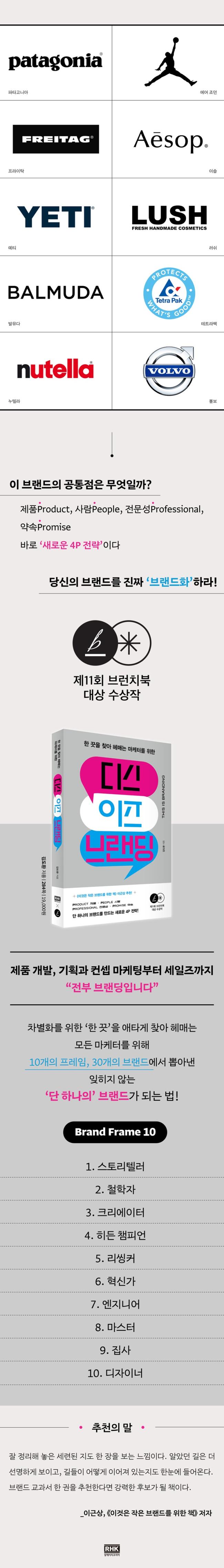 ÀÌ Ã¥Àº Á¦11ȸ ºê·±Ä¡ºÏ ÃâÆÇ ÇÁ·ÎÁ§Æ® ´ë»ó ¼ö»óÀÛÀ¸·Î, ¹«·Á 9,000Æí¿¡ °¡±î¿î ÀÀ¸ðÀÛ Áß ´ë»óÀ¸·Î ¼±Á¤µÇ¾ú´Ù. ±× °æÀï·üÀÌ 800:1À» Èǽ ¶Ù¾î³Ñ´Â´Ù. ´ë»ó ¼ö»óÀÚÀÎ ±èµµÈ¯Àº ºê·£µå ±âȹÀ» 10³â ÀÌ»ó ÁøÇàÇÑ ¸¶ÄÉÅÍ·Î, ´Ù¾çÇÑ ±â¾÷ ¹× ºê·£µå¿Í Çù¾÷ÇÏ¸ç ¾òÀº ³ëÇϿ츦 ¹ÙÅÁÀ¸·Î È¿°úÀûÀÌ°í ¼º°øÀûÀÎ ºê·£µùÀ» ÇÏ´Â ¹æ¹ýÀ» ÀÌ Ã¥¿¡ ´ã¾Ò´Ù. ƯÈ÷ ±×´Â ÀÌ Ã¥¿¡¼ ºê·£µå¸¦ ±¸ÃàÇϱâ À§ÇÑ ¡®»õ·Î¿î 4P Àü·«¡¯À» Á¦½ÃÇÑ´Ù. ¼Òºñ ÆÐÅÏÀÌ ´Þ¶óÁø °í°´À» °í·ÁÇÏÁö ¾Ê¾Ò´ø ¸¶ÄÉÆÃÀÇ ±âÁ¸ 4P Àü·«(Á¦Ç° Product, °¡°Ý Price, ÆÇÃË Promotion, À¯Åë °æ·Î Place)ÀÌ ¾Æ´Ñ, »õ·Î¿î 4P Àü·«(Á¦Ç° Product, »ç¶÷ People, Àü¹®¼º Professional, ¾à¼Ó Promise)ÀÌ´Ù. À̸¦ ±âÁØÀ¸·Î ºê·£µå¸¦ 10°¥·¡·Î ³ª´©°í, ±×¿¡ ¸Â´Â 30°³ÀÇ ºê·£µå¸¦ ¼±Á¤ÇØ ±×µéÀÇ ¹æ½ÄÀ» ¼³¸íÇÑ´Ù. ¼º°øÀ» Á¿ìÇÏ´Â °ÍÀº ¡®ÇÑ ²ý¡¯À̶ó°íµé ÇÑ´Ù. ºê·£µùÀ» ´ã´çÇÏ´Â ¸¶ÄÉÅÍ È¤Àº ÀڽŸ¸ÀÇ ºê·£µå¸¦ ¸¸µé°í ½ÍÀº â¾÷ÀÚ¶ó¸é ÀÌ Ã¥¿¡ ÁÖ¸ñÇÏÀÚ. ´ç½Å¸¸ÀÇ ¡®ÇÑ ²ý¡¯À» ¹ß°ßÇÒ ¼ö ÀÖÀ» °ÍÀÌ´Ù.