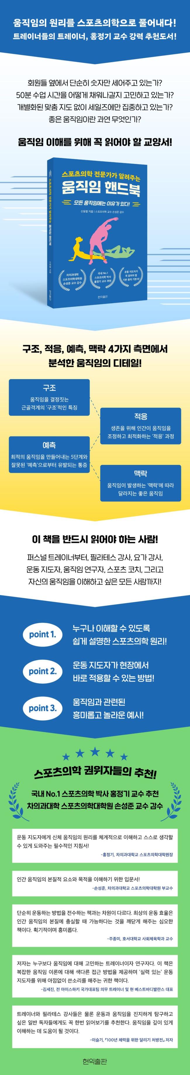 ½ºÆ÷Ã÷ÀÇÇÐ Àü¹®°¡·Î ¿À·£ °æÇèÀ» ½×¾Æ¿Â ÀúÀÚ´Â ±¸Á¶, ÀûÀÀ, ¿¹Ãø, ¸Æ¶ô 4°¡ÁöÀÇ Ãø¸é¿¡¼ ¿òÁ÷ÀÓÀ» ºÐ¼®ÇÑ´Ù. ù ¹øÂ°·Î, ¿òÁ÷ÀÓÀ» °áÁ¤Áþ´Â °³ÀÎ °íÀ¯ÀÇ ±Ù°ñ°Ý°èÀÇ ¡®±¸Á¶¡¯¸¦ ÆÄ¾ÇÇÑ´Ù. µÎ ¹øÂ°·Î, »ýÁ¸À» À§ÇØ Àΰ£ÀÌ ¿òÁ÷ÀÓÀ» Á¶Á¤Çϰí ÃÖÀûÈÇÏ´Â ¡®ÀûÀÀ¡¯ °úÁ¤À» »ìÆìº»´Ù. ¼¼ ¹øÂ°·Î, ¡®¿¹Ãø¡¯À» Æ÷ÇÔÇÏ¿© ÃÖÀûÀÇ ¿òÁ÷ÀÓÀ» ¸¸µå´Â 5´Ü°è¿Í À߸øµÈ ¿¹ÃøÀ¸·ÎºÎÅÍ À¯¹ßµÇ´Â ÅëÁõ±îÁö »ìÆìº»´Ù. ³× ¹øÂ°·Î, ¿òÁ÷ÀÓÀº °í¸³µÇ¾î ¹ß»ýÇÏÁö ¾Ê±â ¶§¹®¿¡ ¿òÁ÷ÀÓÀÌ ¹ß»ýÇÏ´Â ¡®¸Æ¶ô¡¯¿¡ µû¶ó ÁÁÀº ¿òÁ÷ÀÓÀÌ ´Þ¶óÁø´Ù´Â °ÍÀ» ¼³¸íÇÑ´Ù. ¾î·Á¿ï ¼ö ÀÖ´Â ½ºÆ÷Ã÷ÀÇÇÐ ±â¹ÝÀÇ ¿òÁ÷ÀÓ ¿ø¸®¸¦ ´©±¸³ª ¾Ë±â ½±°í Èï¹Ì·Ó°Ô Ç®¾î³Â´Ù.