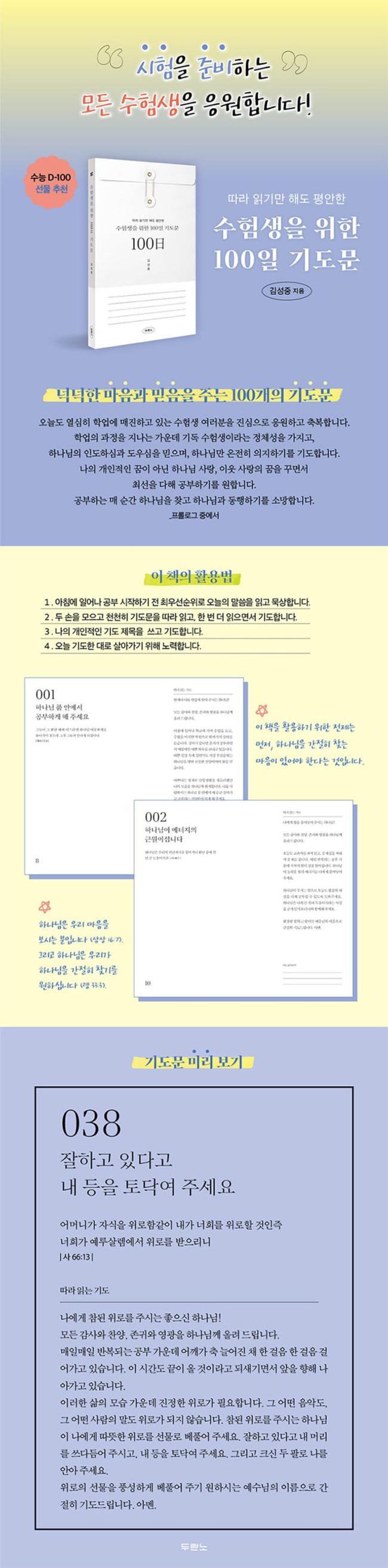 Áö³ÇÑ °øºÎÀÇ ½Ã°£À» Åë°úÇÏ´Â µ¿¾È ±âµ¶ ¼öÇè»ýÀ̶ó´Â Á¤Ã¼¼ºÀ» °¡Áö°í, °øºÎÇÏ´Â ¸ñÀûÀ» ¸íÈ®ÇÏ°Ô ¾Ë¸ç, °³ÀÎÀûÀÎ ¼º°øÀÌ ¾Æ´Ñ Çϳª´Ô »ç¶û, ÀÌ¿ô »ç¶ûÀ» ½ÇõÇϱâ À§ÇØ ¿½ÉÈ÷ °øºÎÇϵµ·Ï µ½´Â´Ù. ½ÃÇèÀ» ¾ÕµÎ°í µÎ·Á¿ò°ú ºÒ¾È°¨ÀÌ ¸ô·Á¿Ã ¶§¸¶´Ù ¸ÅÀÏ ÇÑ À徿 ¸»¾¸À» ¹¬»óÇϸç, ±âµµ¹®À» µû¶ó ÀÐ°í ±âµµÇÔÀ¸·Î ¼¼»óÀÌ ÁÙ ¼ö ¾ø´Â Æò¾È°ú À§·Î¸¦ ¾òÀ» ¼ö ÀÖ´Ù.