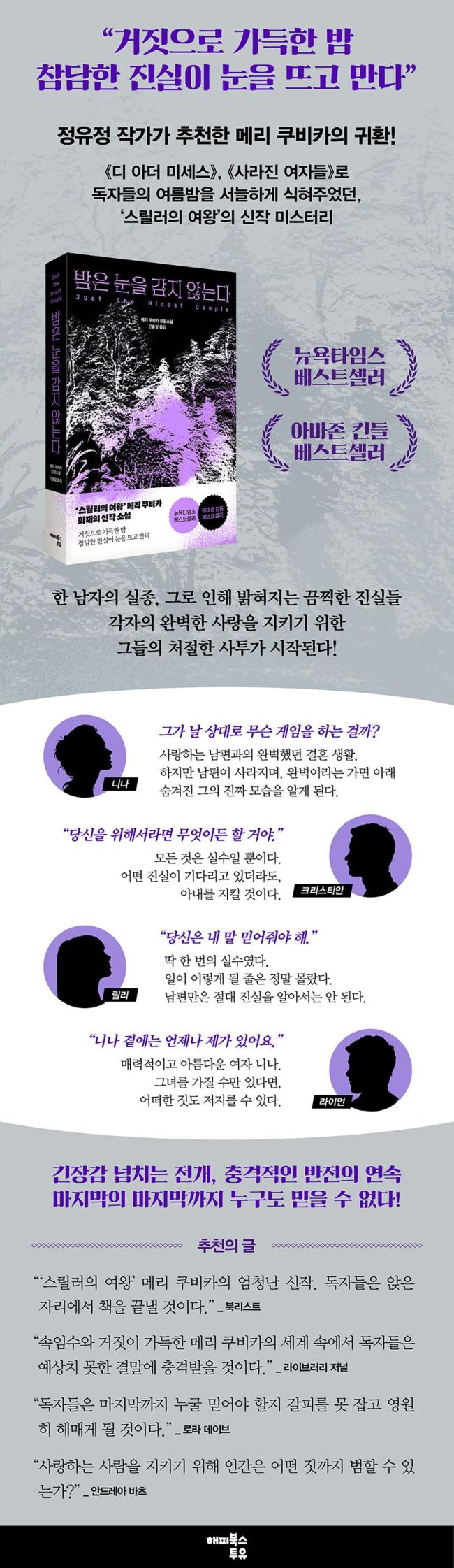 ¡¶¹ãÀº ´«À» °¨Áö ¾Ê´Â´Ù¡·´Â ¾î´À ³¯ °©Àڱ⠽ÇÁ¾µÈ ³²ÆíÀ¸·Î ÀÎÇØ, °¨ÃçÁ® ÀÖ´ø Áø½ÇÀÌ µå·¯³ª¸ç ÆÄ±¹À¸·Î Ä¡´Ý´Â ºÎºÎÀÇ À̾߱⸦ ±×¸®°í ÀÖ´Ù. ÀÛ°¡´Â ¿ì¸®¿¡°Ô Àͼ÷ÇÏ´ø ¸ðµç °ÍµéÀÌ µÎ·Á¿ò°ú ¹ÌÁöÀÇ Á¸Àç·Î ġȯµÇ´Â °øÆ÷¸¦ »ýµ¿°¨ ÀÖ°Ô ´ã¾Æ³»¾ú´Ù. ÀüÀÛº¸´Ù ´õ ±í°Ô Àΰ£ ³»¸é¿¡ °¨ÃçÁø º»ÁúÀûÀÎ ¿å¸ÁÀ» ÆÄ°íµé¸ç, ºñÀǵµÀû ¾ÇÀÇ·Î °¡µæÇÑ ¹ãÀÇ ¼¼°è·Î ¿ì¸®¸¦ ÃÊ´ëÇÑ´Ù.