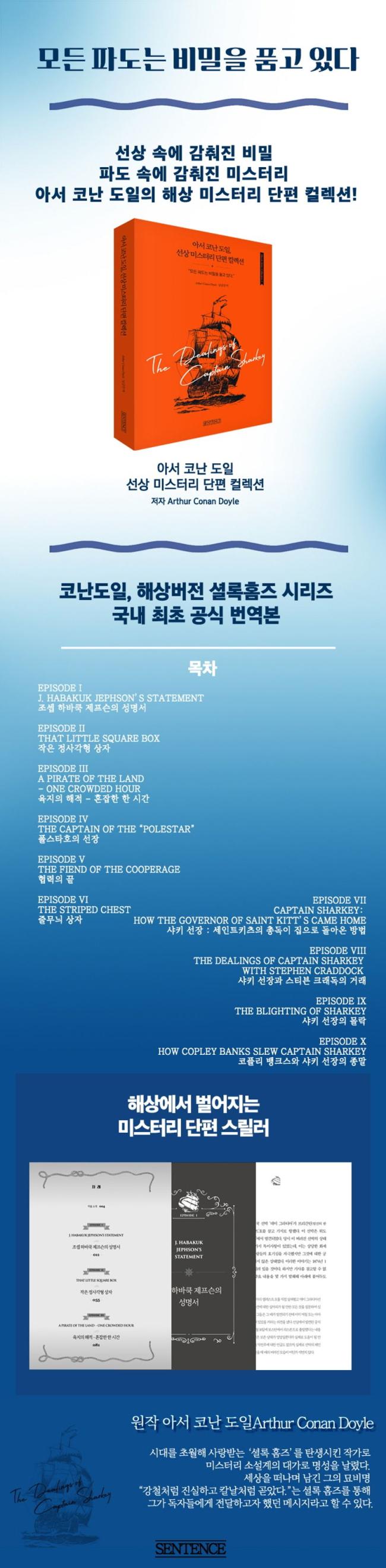<¾Æ¼ ÄÚ³ µµÀÏ, ¼±»ó ¹Ì½ºÅ͸® ´ÜÆí ÄÝ·º¼Ç>Àº ¿À´Ã±îÁöµµ »ç¶û¹Þ°í ÀÖ´Â <¼È·Ï ȨÁî>ÀÇ ÀúÀÚ ¾Æ¼ ÄÚ³ µµÀÏÀÇ ¼±»ó ´ÜÆí 10°¡Áö¸¦ ´ãÀº ÀÛǰÀÔ´Ï´Ù. ÀÌ Ã¥Àº 1922³â Á¸ ¸Ó·¹ÀÌ ÃâÆÇ»ç¿¡¼ ¡¶Tales of Pirates and Blue Water(ÇØÀû°ú Ǫ¸¥ ¹° À̾߱â)¡··Î Ãâ°£µÇ¾ú´Ù°¡, ¡¶The Dealings of Captain Sharkey, and Other Tales of Pirates(»þŰ ¼±ÀåÀÇ ¿©Çà & ÇØÀû ½ÅÈ)¡·¶ó´Â Á¦¸ñÀ¸·Î 1925³â ÀçÃâ°£µÇ¾ú½À´Ï´Ù. ±¹³»¿¡´Â ¿µ¾î ¿ø¹®À¸·Î¸¸ µé¾î¿Í ÀÖ°í, ÀÌ Ã¥ÀÌ ±¹³» ÃÖÃÊÀÇ °ø½Ä ¹ø¿ªº»ÀÔ´Ï´Ù.