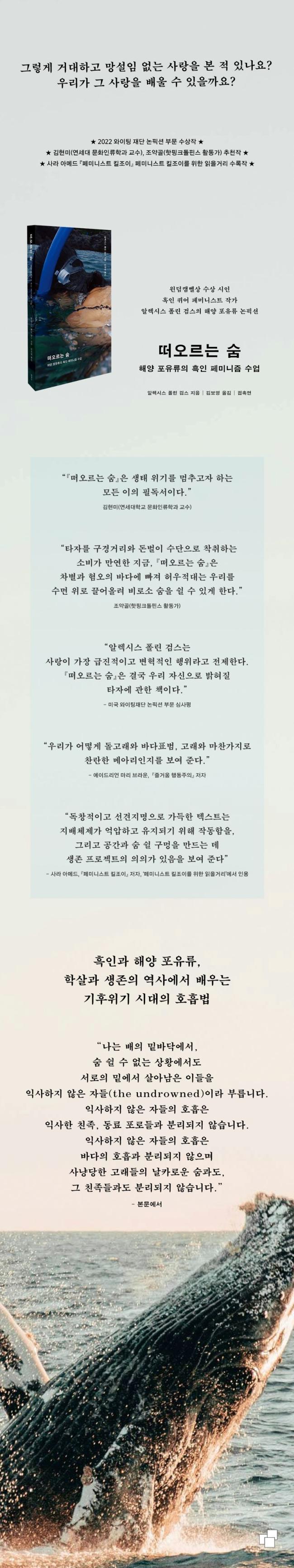 Àú¸íÇÑ ÈæÀÎ Äû¾î Æä¹Ì´Ï½ºÆ® ¿¬±¸ÀÚÀÌÀÚ ½ÃÀÎÀÎ ¾Ë·º½Ã½º Æú¸° °Ë½º´Â ÇØ¾ç Æ÷À¯·ù¿Í ÈæÀÎÀÌ ¾î¶»°Ô »ìÇØ´çÇÏ°í ¾î¶»°Ô »ì¾Æ³²¾Ò´ÂÁö, ¿ì¸® °ç¿¡ ³²Àº À¯»êÀº ¹«¾ùÀÎÁö, ¿ì¸®¿Í ±×µéÀÇ È£ÈíÀÌ ¿©ÀüÈ÷ ¿¬°áµÇ¾î ÀÖ´Ù´Â °ÍÀ» ¾î¶»°Ô ¾Ë¾ÆÃ§ ¼ö ÀÖ´ÂÁö¸¦ ޱ¸ÇÑ´Ù. ¾¾¶óÀÌÇÁÆÄÅ©¿¡ Æ÷ȹµÈ ¼ö¸¹Àº µ¹°í·¡ÀÇ À̸¥ Á×À½, ´ë´ÜÇÑ ÇнÀ´É·Â°ú âÀÇÀûÀÎ °ø¿¬À¸·Î ¸í¼ºÀ» ¾òÀº µ¹°í·¡µé¿¡°Ô¼ ¡®´ç½Å¡¯À» º»´Ù. 1741³â ¹ß°ßµÈ ¹Ù´Ù Æ÷À¯·ù°¡ °¡Á×°ú ÅÐÀ» ³ë¸° ¹Ù´Ù »ç³É²Ûµé ¶§¹®¿¡ 27³â ¸¸¿¡ ¸êÁ¾ÇÑ »ç·Ê¸¦ ´Ù·ç¸ç ¡®¹ß°ßµÇ´Â °ÍÀÇ À§ÇèÇÔ¡¯À» ¸»ÇÑ´Ù. ÀÌ·¯ÇÑ ÅëÂûÀº ³ë¿¹·Î »ì¾Ò´ø ¼±Á¶µéÀ» ¸¶ÁÖÇÏ´Â °ÍÀ¸·ÎºÎÅÍ Ãâ¹ßÇÑ´Ù.