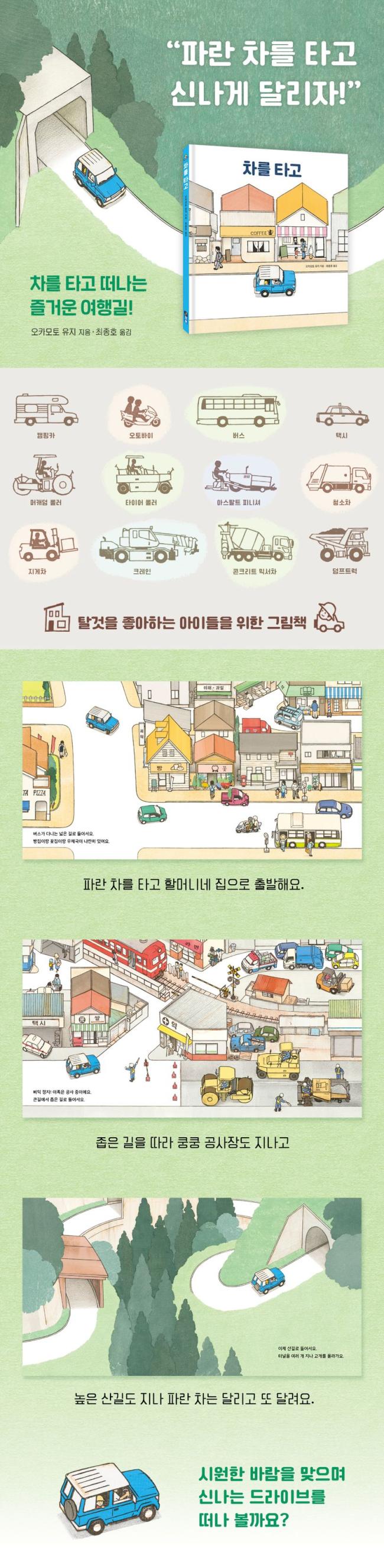 ¡¶Â÷¸¦ Ÿ°í¡·´Â ÇÒ¸Ó´Ï³× ÁýÀ¸·Î ÇâÇÏ´Â ÆÄ¶õ Â÷ÀÇ Áñ°Å¿î ¿©Á¤À» ±×¸° ±×¸²Ã¥ÀÔ´Ï´Ù. ºÎµå·¯¿î »öä·Î Âï¾î ³½ ¼¶¼¼ÇÑ ¸ñÆÇÈ·Î Â÷¸¦ Ÿ°í °¡´Â dz°æÀ» ±Í¿±°íµµ ´ã¹éÇÏ°Ô Ç¥ÇöÇß½À´Ï´Ù. ±ÁÀ̱ÁÀÌ À̾îÁö´Â ±æ À§¸¦ ´Þ¸®´Â ÆÄ¶õ Â÷¸¦ µû¶ó°¡´Ù º¸¸é ´ÙÀ½¿¡´Â ¾î¶² ±æÀÌ ³ªÅ¸³¯Áö ±Ã±ÝÇØÁý´Ï´Ù. ³¡À¸·Î ¸¶Áö¸· Àå¿¡¼´Â ±æ¿¡¼ ¸¸³ Ư»ö ÀÖ´Â Å»°ÍµéÀ» ¼Ò°³ÇØ Å»°ÍÀ» ÁÁ¾ÆÇÏ´Â ¾ÆÀ̵鿡°Ô Å« Àç¹Ì¸¦ ¼±»çÇÕ´Ï´Ù. ½Ã¿øÇÑ ¹Ù¶÷ÀÌ ¼Ö¼Ö ºÒ¾î¿À´Â Áñ°Å¿î ¹æ¹®±æ¿¡ ÇÔ²²ÇØ º¸¼¼¿ä. ¸¶À½±îÁö ¹à¾ÆÁö´Â Áñ°Å¿î µå¶óÀ̺갡 ÆîÃÄÁú °Å¿¹¿ä!