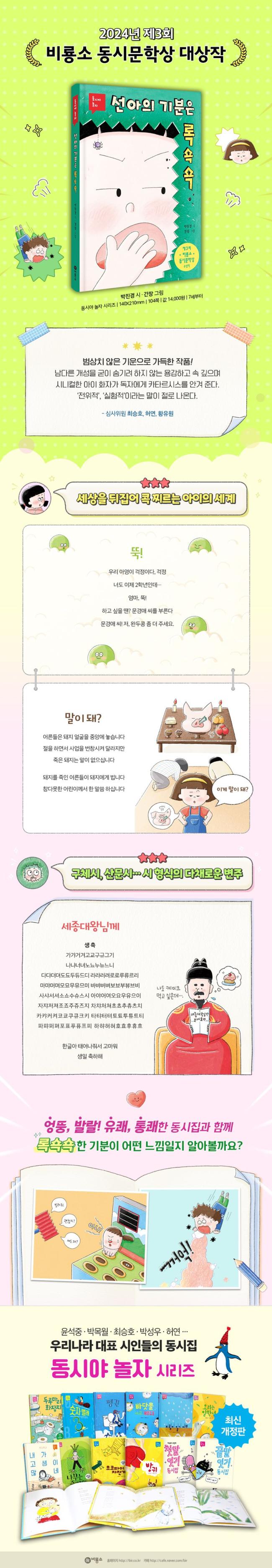 ÅëÅë Æ¢´Â ½Ã¾î, µ¶Ã¢ÀûÀÎ ½Ã°¢, ½Å¼±ÇÑ ¹ß»óÀÌ µ¸º¸ÀÌ´Â ÃÑ 42ÆíÀÇ µ¿½Ã°¡ 3ºÎ·Î ³ª´µ¾î ¼ö·ÏµÇ¾ú´Ù. 1ºÎ ¡¸¼±¾ÆÀÇ ±âºÐÀº ·Ï¼ï¼ï¡¹¿¡¼´Â Çб³»ýȰ°ú ±³¿ì °ü°è¸¦, 2ºÎ ¡¸²Î²Î³ª¹«¿¡ ¼ûÀ»·¡¡¹¿¡¼´Â °¡Á¤°ú ÀÏ»ó»ýȰÀ», 3ºÎ ¡¸´ÏÇÏ¿À, ¸»ÇÏ´Â ¸ù½ÇÀÌ¡¹¿¡¼´Â ÀÚ¿¬°ú µ¿½Ä¹°À» ¼ÒÀç·Î ÇÑ ½Ã°¡ ¹¿© ÀÖ´Ù. ¡°ÁøÁÖ¸¦ ǰ±â±îÁö ÀÔ¼Ó¿¡¼ ¼ö¸¹Àº ¸ð·¡¸¦ ¾Ã´Â Á¶°³Ã³·³, ¾î¸°À̸¦ ´ë½ÅÇØ ¸ð·¡¸¦ ¾Ã¾î ÁøÁÖ¸¦ °Ç³×°í ½Í´Ù.¡±¶ó´Â ¸¶À½À¸·Î ²ÙÁØÈ÷ ½Ã¸¦ ½á ¿Â ¹ÚÁø°æ ½ÃÀÎÀÇ Ã¹ µ¿½ÃÁýÀÌ´Ù.