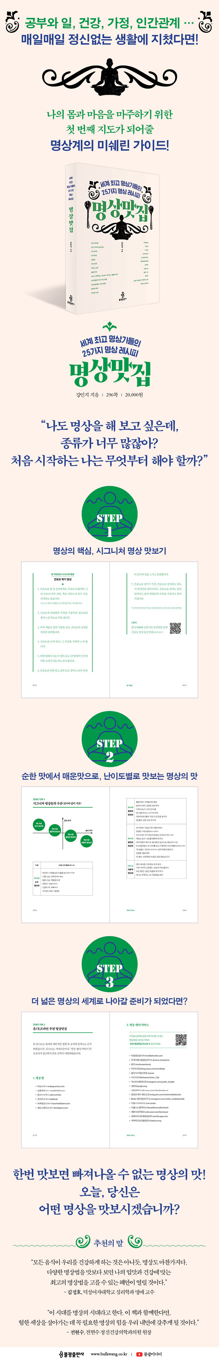 ÀÌ °í¹ÎÀ» ÇØ°áÇØ Áִ åÀÌ ¹Ù·Î ¡º¸í»ó¸ÀÁý¡»ÀÌ´Ù. ÀÌ Ã¥Àº ÀúÀÚ°¡ µ¶ÀÚ ´ë½Å °Å¸§¸ÁÀ» µé°í¼ ¸í»óÀÇ ¹Ù´Ù¿¡¼ °ÇÁ®³½ ¸í»ó°¡µéÀÇ À̾߱â¿Í ±×µéÀÇ ½Ã±×´Ïó ¸í»óÀ» º¸¿© ÁØ´Ù. ¼¼°èÀÇ ¿Â°® ¸í»óÀ» °øºÎÇÑ ÈÄ Á÷Á¢ ¸í»ó Áöµµ»ç°¡ µÇ¾î ¿©·¯ ¸í»ó ÇÁ·Î±×·¥À» À̲ö °æÇèÀÌ Ç³ºÎÇÑ ÀúÀÚ´Â, ¸Þ´ºÆÇ ¾Õ¿¡¼ ¹«¾ó °ñ¶ó¾ß ÇÒÁö Çì¸Å´Â Ãʺ¸ ¸í»ó°¡¿¡°Ô ÇÊ¿äÇÑ °ÍÀ» ´Ü¹ø¿¡ ¾Ë¾ÆÂ÷¸°´Ù. ¡º¸í»ó¸ÀÁý¡»Àº ÀúÀÚ°¡ ÇÑ¹ß ¸ÕÀú ±Í¶êÇØ ÁÖ´Â ¸í»ó ÈıâÀÌÀÚ ¸í»ó ÀÔ¹®ÀÚ°¡ ´Ù¾çÇÏ°Ô µµÀüÇÒ ¼ö ÀÖµµ·Ï ±æÀ» Á¦½ÃÇÏ´Â °¡À̵åÀÌ´Ù. Ã¥Àº °¢ÀÚÀÇ ºÐ¾ß¿¡¼ Ȱµ¿ÇÏ´Â ¼¼°èÀûÀÎ ¸í»ó ÁöµµÀÚµé°ú ¸í»óÀÇ ±âº» »À´ë¸¦ ¼¼¿î À̵éÀ» ²Ä²ÄÇÏ°Ô ºÐ¼®ÇÏ°í ¼±º°ÇÏ¿© ¿ì¸®ÀÇ ´«¾Õ¿¡ ³»³õ´Â´Ù. ¿ì¸®´Â ÀÌ Ã¥À» ÀÐÀ¸¸ç ÀúÀÚ°¡ ³»º¸ÀÎ ¸í»ó ¸Þ´º¸¦ Çϳª¾¿ ¸Àº¸°í, ¹«¾ùÀÌ ÀÚ½ÅÀÇ ÀÔ¸À¿¡ ¸Â´ÂÁö À½¹ÌÇϱ⸸ ÇÏ¸é µÈ´Ù.