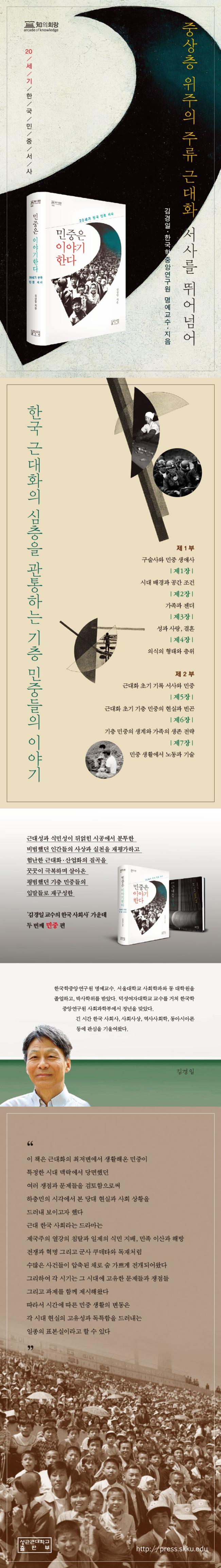 ÀÌ Ã¥¿¡¼ ÀúÀÚ´Â ¡®¹ÎÁßÀÚ¼Àü¡¯À̳ª ¡®¹ÎÁß¿Àü¡¯ µîÀ¸·Î ±âȹµÈ ¸£Æ÷, ÀÎÅÍºä ¼Ó ¹ÎÁß ±¸¼ú ÀÚ·áµéÀ» Àü°Å »ï¾Æ Æò¹üÇÑ »ç¶÷µéÀÌ Åоî³õ´Â °áÄÚ Æò¹üÇÏÁö ¾ÊÀº À̾߱âµé·Î ±Ù´ëÈ À̸éÀÇ ¼»ç¸¦ À籸ÃàÇÑ´Ù. ±×¸®°í ¼¼´ë¤ý¼º¤ý°è±Þ/°èÃþÀ̶õ ¼¼ º¯¼ö¸¦ ÁÖ¿ä ÁöÇ¥·Î »óÁ¤ÇØ, ±Ù´ëÈÀÇ ½Ã±â¸¦ »ì¾Æ¿Â ¹ÎÁß °¢ÀÚ°¡ ¾î¶°ÇÑ ¹æ½ÄÀ¸·Î ±×°ÍÀ» °æÇèÇÏ°í ±¸ÇöÇØ¿Ô´ÂÁö, ±×·¯ÇÑ °æÇè°ú ±â¾ïÀÌ Åõ»çÇÏ´Â ½Ã´ë»ó°ú »çȸ»óÀÇ ½ÇÁ¦´Â ¾î¶°Çß´ÂÁö ½ÉÃþ ºÐ¼®Çسª°£´Ù. ¹«¾ùº¸´Ù ÀÌ·¸°Ô À籸¼ºµÈ ´ë¾ÈÀÇ ¹ÎÁß ¼»ç´Â ±âÁ¸ÀÇ ÁÖ·ù ¼»ç ¹× ¿¬±¸µé°ú´Â ´Ù¸¥ Â÷¿ø¿¡¼ ¿ì¸®°¡ °É¾î¿Â ±Ù´ëÈ °úÁ¤À» µÇ¤¾îº¸°Ô ÇÒ °ÍÀÌ´Ù. ±×·¯´Ï ¿ì¸®´Â ´Ù½Ã ¹°¾î¾ß ÇÑ´Ù. Çѱ¹ ±Ù´ëÈÀÇ ÁÖÀΰøÀº °ú¿¬ ´©±¸¿´´ÂÁö.