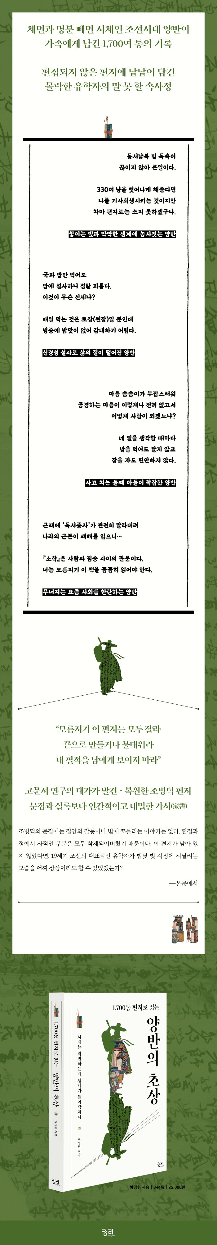 ÆíÁö´Â Àϱ⸸г»¹ÐÇÑ ±ÛÀÌ´Ù. ü¸é°ú ¸íºÐ »©¸é ½Ãü¶ó ÇÒ ¼ö ÀÖ´Â ±× ¿¾³¯ Á¶¼±½Ã´ë ¾ç¹Ý ¿ª½Ã ÆíÁö¸¦ ¾²¸ç ¹Î³¸À» µå·¯³Â´Ù. ÀÌ Ã¥ ¡º¾ç¹ÝÀÇ ÃÊ»ó¡»Àº 19¼¼±â Á¶¼± ÈıâÀÇ À¯ÇÐÀÚ Á¶º´´öÀÌ °¡Á·¿¡°Ô ³²±ä ÆíÁö ¸ðÀ½ÁýÀ¸·Î, ¡º¾ç¹ÝÀÇ »ç»ýȰ¡»(Ǫ¸¥¿ª»ç, 2008)ÀÇ °³Á¤ÆÇÀÌ´Ù. ±×µ¿¾È º¹°£À» ¹Ù¶ó´Â ¿©·¯ ±â´Ù¸²ÀÌ ÀÖ¾ú°í, 16³â ¸¸¿¡ ±Ã¸®¿¡¼ µµÆÇ, ¿ø¹® Å»ÃÊ, ÇØ¼® µî º»¹® üÁ¦¸¦ ´ëÆø ´Þ¸®ÇÏ¿© »õ·Ó°Ô µ¶ÀÚ¸¦ ã¾Æ¿Ô´Ù.