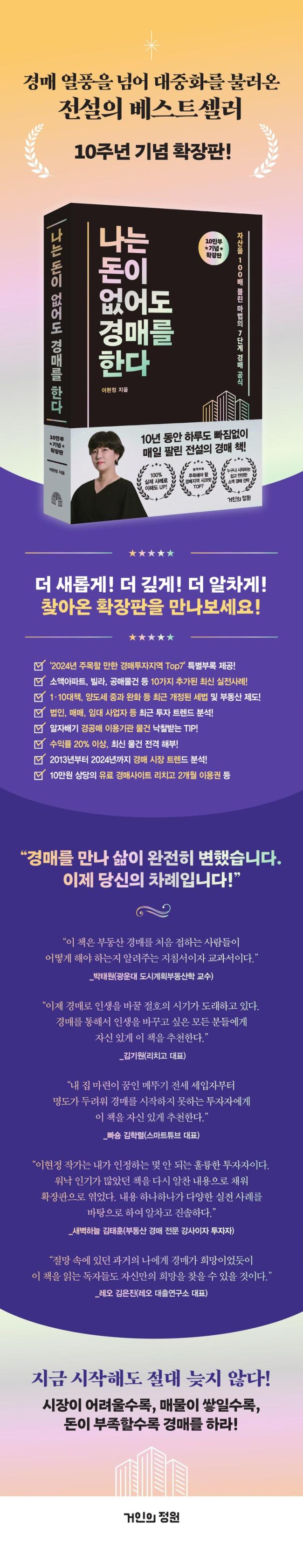 ºÎµ¿»ê ½ÃÀåÀÇ º¯È¹«½ÖÇÑ µî¶ô¿¡µµ 10¿© ³â µ¿¾È °æ¸Å ½ÃÀåÀ» ¶°³ ÀûÀÌ ¾ø´Â ÀúÀÚ´Â ÃÊÆÇ Ãâ°£ ´ç½Ã¿¡´Â ÅõÀÚ¸¦ 3³â Á¤µµ ÇÑ ¡®°æ¸Å ÀßÇÏ´Â Ãʺ¸ÀÚ¡¯¿´Áö¸¸ Áö±ÝÀº ¸í½Ç»óºÎÇÑ ¡®´ëÇѹα¹ °æ¸Å ºÐ¾ßÀÇ ´ëÇ¥ Àü¹®°¡¡¯·Î ¼ºÀåÇß´Ù. À̹ø È®ÀåÆÇ¿¡¼´Â Áö³ 10³â°£ ½×ÀÎ ½ÇÀü °æÇè°ú ³ëÇÏ¿ì»Ó¸¸ ¾Æ´Ï¶ó 10°¡Áö Ãֽаæ¸Å¹°°Ç »ç·Ê, °³Á¤µÈ ¼¼¹ý, 1¡¤10ºÎµ¿»ê´ëÃ¥ µî ´õ »õ·Ó°í ±íÀÌ ÀÖ´Â ³»¿ëÀ» Ãß°¡Çß´Ù. ¶ÇÇÑ º» Ã¥¿¡ Æ÷ÇÔµÈ Æ¯º°ºÎ·Ï <2024³â ÁÖ¸ñÇÒ ¸¸ÇÑ °æ¸ÅÅõÀÚÁö¿ª Top7>À» ÅëÇØ ÇöÀç ÀúÀÚ°¡ ÁÖ¸ñÇÏ´Â Àϰö °³ÀÇ Áö¿ªÀ» µ¥ÀÌÅ͸¦ ±â¹ÝÀ¸·Î ³¹³¹ÀÌ °ø°³Çß´Ù. ÃÖ±Ù °Ýµ¿ÇÏ´Â ½ÃÀå¿¡¼ ¾îµð¿¡ ÅõÀÚÇØ¾ß ÇÒÁö È¥¶õ½º·¯¿î Ãʺ¸ ÅõÀÚÀڵ鿡°Ô Å« ÈûÀÌ µÉ °ÍÀÌ´Ù.