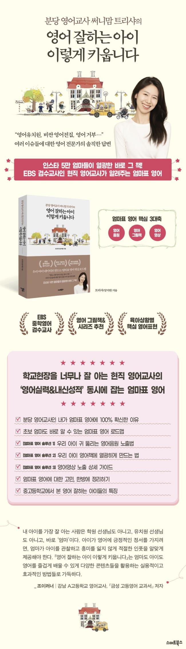 ÀúÀÚ´Â ¡®¾ö¸¶Ç¥ ¿µ¾î¡¯¸¦ ÅëÇØ ¾ÆÀÌÀÇ ¿µ¾î½Ç·Â»Ó ¾Æ´Ï¶ó ÀåÂ÷ ´ëÇÐÀԽà ¿µ¾î±îÁö ÀâÀ» ¼ö ÀÖ´Ù°í ÇÑ´Ù. ¡º¿µ¾î ÀßÇÏ´Â ¾ÆÀÌ ÀÌ·¸°Ô Ű¿ó´Ï´Ù¡»¿¡´Â ¸»Çϱ⡤µè±â¡¤Àб⡤¾²±â °°Àº ¿µ¾î½Ç·Â»Ó¸¸ ¾Æ´Ï¶ó ÀåÂ÷ ³»½Å°ú ÀԽñîÁö µ¿½Ã¿¡ Àâ´Â ¡®¾ö¸¶Ç¥ ¿µ¾î¡¯ÀÇ ¹æ¹ýÀ» ¼Ò°³ÇÑ´Ù. ÀνºÅ¸ 5¸¸ ¾ö¸¶µéÀÌ ¿±¤ÇÑ ¹Ù·Î ±× ÄÜÅÙÃ÷, ¿ì¸® ¾ÆÀÌ ³×ÀÌÆ¼ºê ¸¸µå´Â ¾ö¸¶Ç¥ ¿µ¾î ÇÙ½É ³ëÇϿ츦 ¾òÀ» ¼ö ÀÖÀ» °ÍÀÌ´Ù.