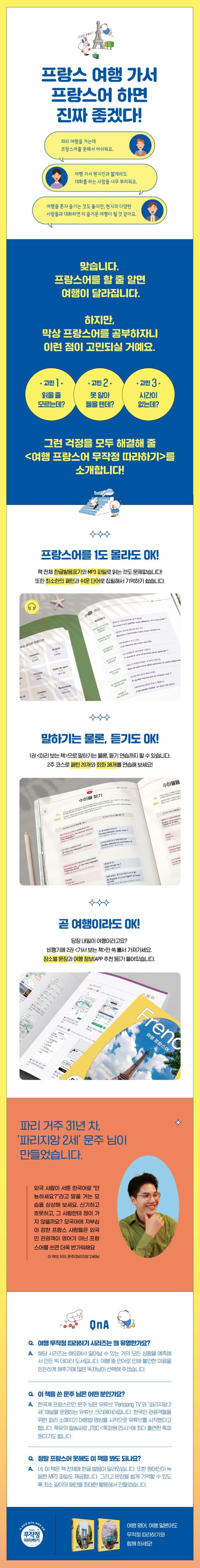 ÀÌ Ã¥Àº Á¦¸ñ ±×´ë·Î ¿©Çà °¡¼ ÇÏ´Â ÇÁ¶û½º¾î¸¦ ¹«ÀÛÁ¤ ÇØ º¸´Â Ã¥ÀÌ´Ù. ÀÌ Ã¥Àº Ãâ±¹ Àü º¸´Â ¡¸¹Ì¸® º¸´Â Ã¥¡¹°ú ÇöÁö¿¡ µµÂøÇؼ ÇÊ¿äÇÑ ³»¿ëÀ» ´ãÀº ¡¸°¡¼ º¸´Â Ã¥¡¹ µÎ ±ÇÀ¸·Î ±¸¼ºµÇ¾î ÀÖ´Ù. Ãâ±¹ 2ÁÖ ÀüºÎÅÍ ¡¸¹Ì¸® º¸´Â Ã¥¡¹À» º¸°í Ãâ±¹ÇÒ ¶§ ¡¸°¡¼ º¸´Â Ã¥¡¹À» °£ÆíÇÏ°Ô ½ï »©¼ °¡¹æ¿¡ ³Ö¾î°¡¸é µÈ´Ù. Çѱ¹°è ÇÁ¶û½ºÀÎÀÎ ÀúÀÚ´Â ¸ÅÀÏ µè´Â »ý»ýÇÑ ÇÁ¶û½º¾î¿Í °ü±¤°´À» À§ÇÑ ¿©Çà Á¤º¸¸¦ Ã¥¿¡ ´ã¾Ò´Ù. ¿©·¯ »óȲ¿¡¼ ÅëÇÏ´Â ÆÐÅÏ 20°³¸¦ ¼¼¼¼ÇÏ°Ô Á¤¸®Çß°í, 38°³ÀÇ ÇöÁö ½Ã¹Ä·¹À̼ÇÀ» Á¤¸®ÇØ ÀÌ Ã¥¿¡ ½Ç¾ú´Ù. ¾ð¾î¿¡ ±¹ÇѵÇÁö ¾Ê°í ÀúÀÚ°¡ ¸ðÀº ÇöÁö ²ÜÆÁÀ̳ª, Ç¥Çö ÆÁÀÌ ±¸¼®±¸¼® µé¾îÀÖ´Â °ÍÀÌ ¹¦¹ÌÀÌ´Ù. ÇÁ¶û½º ¿©ÇàÀ» °èȹ ÁßÀÎ µ¶Àںе鿡°Ô ÀÌ Ã¥Àº ¿©ÇàÀÇ Àç¹Ì¸¦ ÁõÆø½ÃÄÑ ÁÖ´Â ÁÁÀº ¼±ÅÃÀÌ µÉ °ÍÀÌ´Ù.