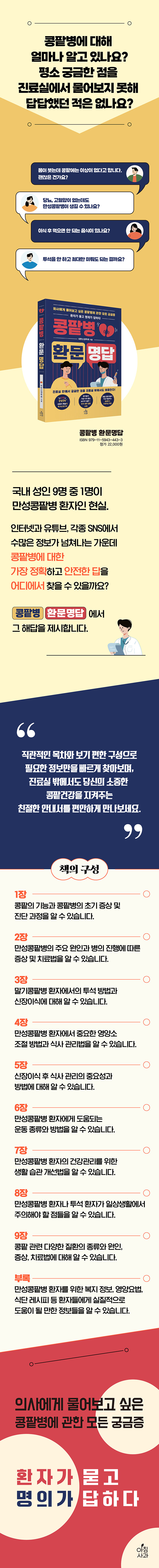 º´¿øÀ» ¹æ¹®Çϰųª ÀÎÅͳÝÀ» °Ë»öÇÒ ¶§¸¶´Ù ¸¶À½ ¼Ó¿¡ ¸Éµ¹¾Ò´ø ÄáÆÏº´¿¡ ´ëÇÑ Áú¹®µé°ú ±× ÇØ´äµéÀÌ ÀÌ Ã¥ ¼Ó¿¡ ¸ðµÎ ´ã°Ü ÀÖ½À´Ï´Ù. ´Ù¾çÇÑ ÄáÆÏÁúȯÀÇ ¿øÀÎ, Áõ»ó, Áø´Ü ¹æ¹ý, Ä¡·á ¿É¼Ç¿¡ ´ëÇÑ Á¤º¸»Ó¸¸ ¾Æ´Ï¶ó ¸¸¼ºÄáÆÏº´ ȯÀÚ¸¦ À§ÇÑ º¹Áö Á¤º¸, ¿µ¾ç¿ä¹ý, ½Ä´Ü ·¹½ÃÇÇ µî ½ÇÁúÀûÀ¸·Î µµ¿òÀÌ µÉ ¼ö ÀÖ´Â Á¤º¸µéÀ» Á¦°øÇÕ´Ï´Ù.