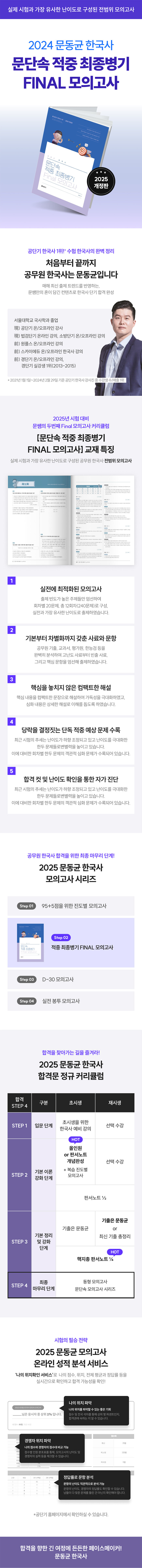 12ȸ(240¹®Á¦)·Î ±¸¼ºµÈ Àü¹üÀ§ ¸ðÀǰí»ç ±³ÀçÀÌ´Ù. ÃâÁ¦ ºóµµ°¡ ³ôÀº ÁÖÁ¦µéÀ» ¼±º°ÇÏ¿© ¹®Á¦¸¦ Á¦ÀÛÇϰí, ½ÇÁ¦ ½ÃÇè°ú °¡Àå À¯»çÇÑ ³À̵µ·Î ±¸¼ºÇÏ¿© ¸ðÀǰí»çÀÇ ¿Ï¼ºµµ¸¦ ³ô¿´´Ù. °ø¹«¿ø ±âÃâ, ±³°ú¼, Æò°¡¿ø, ÇѴɰËÀ» ¾Æ¿ì¸£´Â öÀúÇÑ ºÐ¼®°ú À̸¦ ¹ÙÅÁÀ¸·Î ÇÑ ÇÕ¸®Àû ¿¹Ãø ½Ã½ºÅÛÀ» ÅëÇØ ½ÃÇè¿¡ ÃâÁ¦µÉ ¼ö ÀÖ´Â ³»¿ëµé·Î¸¸ ¾ö¼±ÇÏ¿© ¹®Ç׿¡ ¹Ý¿µÇÏ¿´´Ù.
