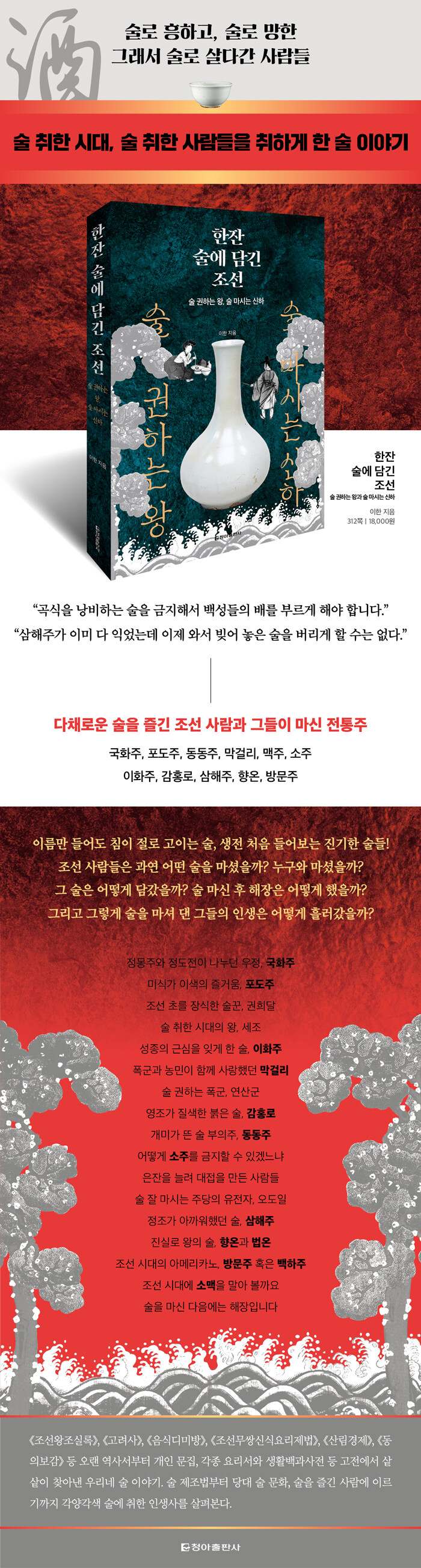 ¸¶½Ã¸é Áñ°Ì°í, ÇÔ²² ¸¶½Ã¸é ´õ ÁÁÀº ¼ú. ¼úÀº Àΰ£ ¿ª»ç¿Í ¹®ÈÀÇ ÇÑ ºÎºÐÀÎ µ¿½Ã¿¡ »çȸ¿¡ ¸¹Àº ÇØ¾ÇÀ» ³¢ÃÄ ¶§·Ð ±ÝÁöµÇ±â±îÁö ÇÑ ¹®Á¦ÀÇ À½·áÀÌ´Ù. ÀÌ Ã¥Àº Á¶¼± ½Ã´ë À¯¸íÇÑ ÀüÅë¼ú°ú ±× ¼úÀ» µÑ·¯½Ñ Àι°µéÀÇ ÀÏȸ¦ ¼Ò°³ÇÑ´Ù.