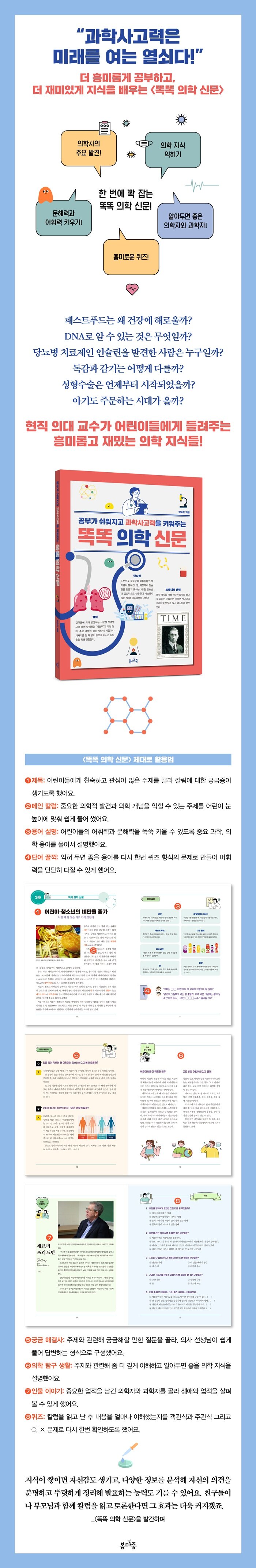 ÀÇÇÐÀ» ÁÖÁ¦·Î ÇÑ, ÃʵîÇлýÀ» À§ÇÑ ½Å¹® Çü½ÄÀÇ Ã¥ÀÌ´Ù. <¸ÞÀÎ Ä®·³>À¸·Î ÀÇÇлçÀÇ ÁÖ¿äÇÑ »ç°ÇÀ» º¸¿©ÁÖ°í, °ü·Ã ÀÇÇÐÁö½ÄÀ̳ª ÀÇÇÐ °³³äÀº <±Ã±Ý ÇØ°á»ç>¿Í <ÀÇÇРŽ±¸ »ýȰ> Äڳʿ¡¼ º¸´Ù ±íÀÌ »ìÆìº¼ ¼ö ÀÖµµ·Ï Çß´Ù. °ü·Ã Àι°µµ <Àι° À̾߱â> Äڳʿ¡¼ ÀÚ¼¼È÷ ¼³¸íÇß°í, Ä®·³À» ÀÐ°í ³ ÈÄ ¾ó¸¶³ª ÀÌÇØÇß´ÂÁö¸¦ <ÄûÁî> Äڳʿ¡¼ °´°ü½Ä°ú ÁÖ°ü½Ä ±×¸®°í ¡Û,¡¿ ¹®Á¦·Î ´Ù½Ã Çѹø È®ÀÎÇÒ ¼ö ÀÖµµ·Ï Çß´Ù.