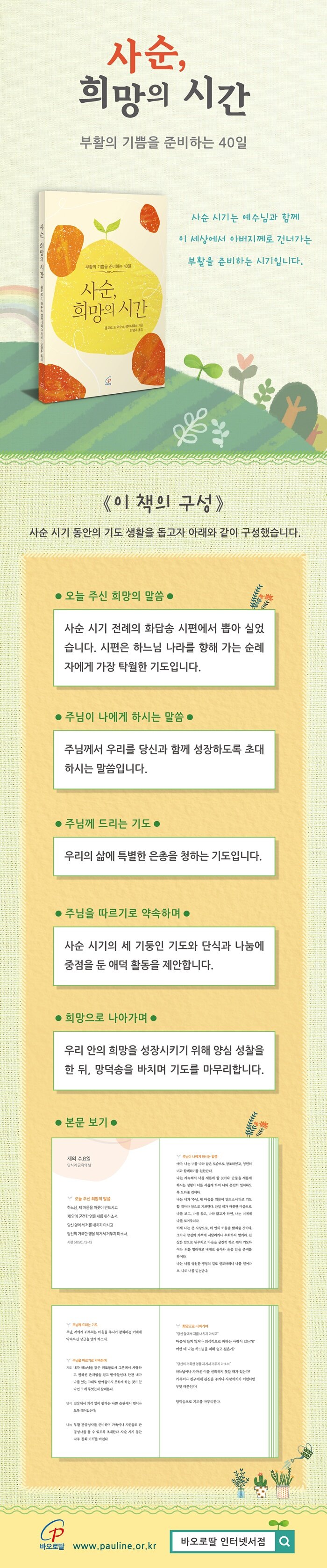 ¸ÕÀú »ç¼ø ½Ã±â Àü·ÊÀÇ È´ä¼Û ½ÃÆíÀ¸·Î ±âµµ¸¦ ÁغñÇϰí, ÁÖ´ÔÀÌ Á÷Á¢ Áֽô ¸»¾¸À» °æÃ»Çϸç, ¿ì¸® »î¿¡ ÀºÃÑÀ» ûÇÏ´Â ±âµµ¸¦ µå¸° µÚ, ±âµµ, ´Ü½Ä, ³ª´®À» ½ÇõÇϰí, ¿À´Ã ÁֽЏ»¾¸À» Åä´ë·Î ÀÚ½ÅÀÇ »îÀ» ¼ºÂûÇÒ ¼ö ÀÖµµ·Ï ±¸¼ºµÇ¾î ÀÖ´Ù.