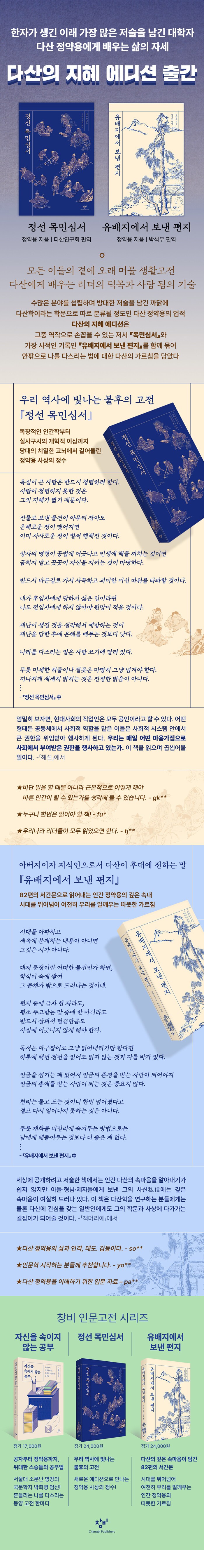 Á¶¼± Èı⠽ÇÇÐÀÇ ´ë°¡ÀÌÀÚ ºÒ¸êÀÇ Áö¼ºÀ¸·Î »ç¶û¹Þ´Â Á¤¾à¿ëÀÇ ÆíÁö±ÛÀ» ¿«Àº ¡ºÀ¯¹èÁö¿¡¼ º¸³½ ÆíÁö¡»°¡ ¡ºÁ¤¼± ¸ñ¹Î½É¼¡»¿Í ÇÔ²² ¡®´Ù»êÀÇ ÁöÇý¡¯ ¿¡µð¼ÇÀ¸·Î »õ·Ó°Ô µ¶ÀÚµéÀ» ã¾Æ°£´Ù. ¹ý, ¹®ÇÐ, Áö¸®, ÀÇÇÐ, »ý¹°ÇÐ µî ¼ö¸¹Àº ºÐ¾ß¸¦ ¼··ÆÇÏ¸ç ¹æ´ëÇÑ Àú¼úÀ» ³²±ä ±î´ß¿¡ ±×ÀÇ ¾÷ÀûÀº ´Ù»êÇÐÀ̶ó´Â Çй®À¸·Î µû·Î ºÐ·ùµÉ Á¤µµÀÌ´Ù. À̹ø ´Ù»êÀÇ ÁöÇý ¿¡µð¼ÇÀº ±×Áß ¿ªÀÛÀ¸·Î ¼Õ²ÅÀ» ¼ö ÀÖ´Â Àú¼¿Í °¡Àå »çÀûÀÎ ±â·ÏÀ» ÇÔ²² ¹°í »õ ¿ÊÀ» ÀÔÇô, ¾ÈÆÆÀ¸·Î ³ª¸¦ ´Ù½º¸®´Â ¹ý¿¡ °üÇÑ ´Ù»êÀÇ °¡¸£Ä§À» ´ã¾Ò´Ù.