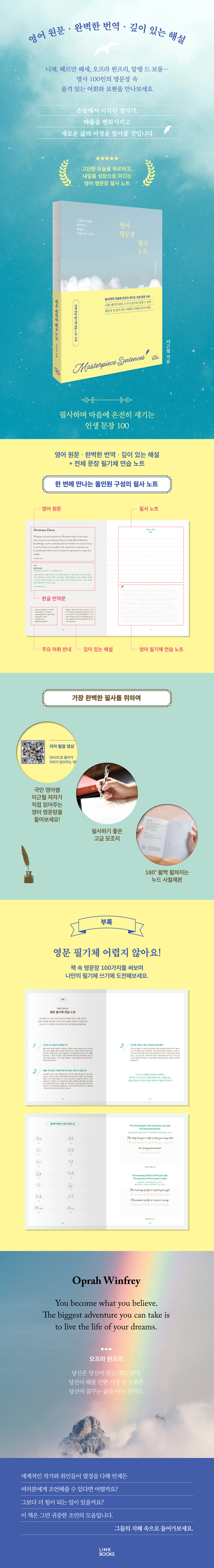 ¡¶¿µ¾î ¸í¹®Àå ÇÊ»ç ³ëÆ®¡·´Â ´Ü¼øÈ÷ ¿µ¾î ¹®ÀåÀ» ÇÊ»çÇϴ åÀÌ ¾Æ´Ï´Ù. ÀÌ Ã¥Àº »îÀÇ º»Áú°ú ¹æÇâÀ» »õ·Ó°Ô ÀÌÇØÇÏ°Ô ¸¸µå´Â Ưº°ÇÑ µ¿¹ÝÀÚ°¡ µÇ¾îÁÙ °ÍÀÌ´Ù. ´Ïü, Ç츣¸¸ Çì¼¼, ¿ÀÇÁ¶ó À©ÇÁ¸®, ¾Ë·© µå º¸Åë °°Àº À§´ëÇÑ Àι°µéÀÌ ³²±ä ¸í¹®ÀåÀ» ¼Õ³¡À¸·Î Á÷Á¢ ¾²¸ç, ±×µéÀÇ ÅëÂû°ú »ç°í¸¦ ³» »î¿¡ ´ã¾Æº¸¼¼¿ä. ±×µéÀÇ ±íÀº ÁöÇý¿Í ¸Þ½ÃÁö´Â ´Ü¼øÈ÷ Àаí Áö³ªÄ¥ ±Û±Í°¡ ¾Æ´Ï¶ó, ¿ì¸® »îÀ» »õ·Î¿î ½Ã°¢À¸·Î ¹Ù¶óº¸°Ô ¸¸µå´Â ±ÍÁßÇÑ ¿¼è°¡ µÉ °ÍÀÌ´Ù.